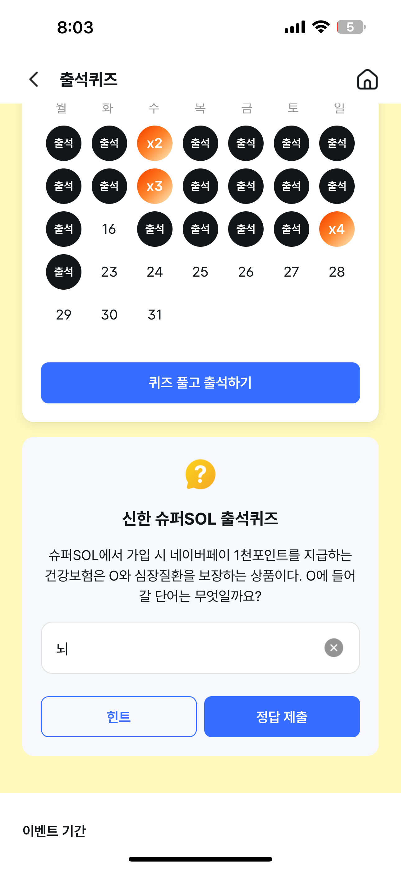 신한 슈퍼SOL 출석퀴즈 정답은 뇌 입니다.