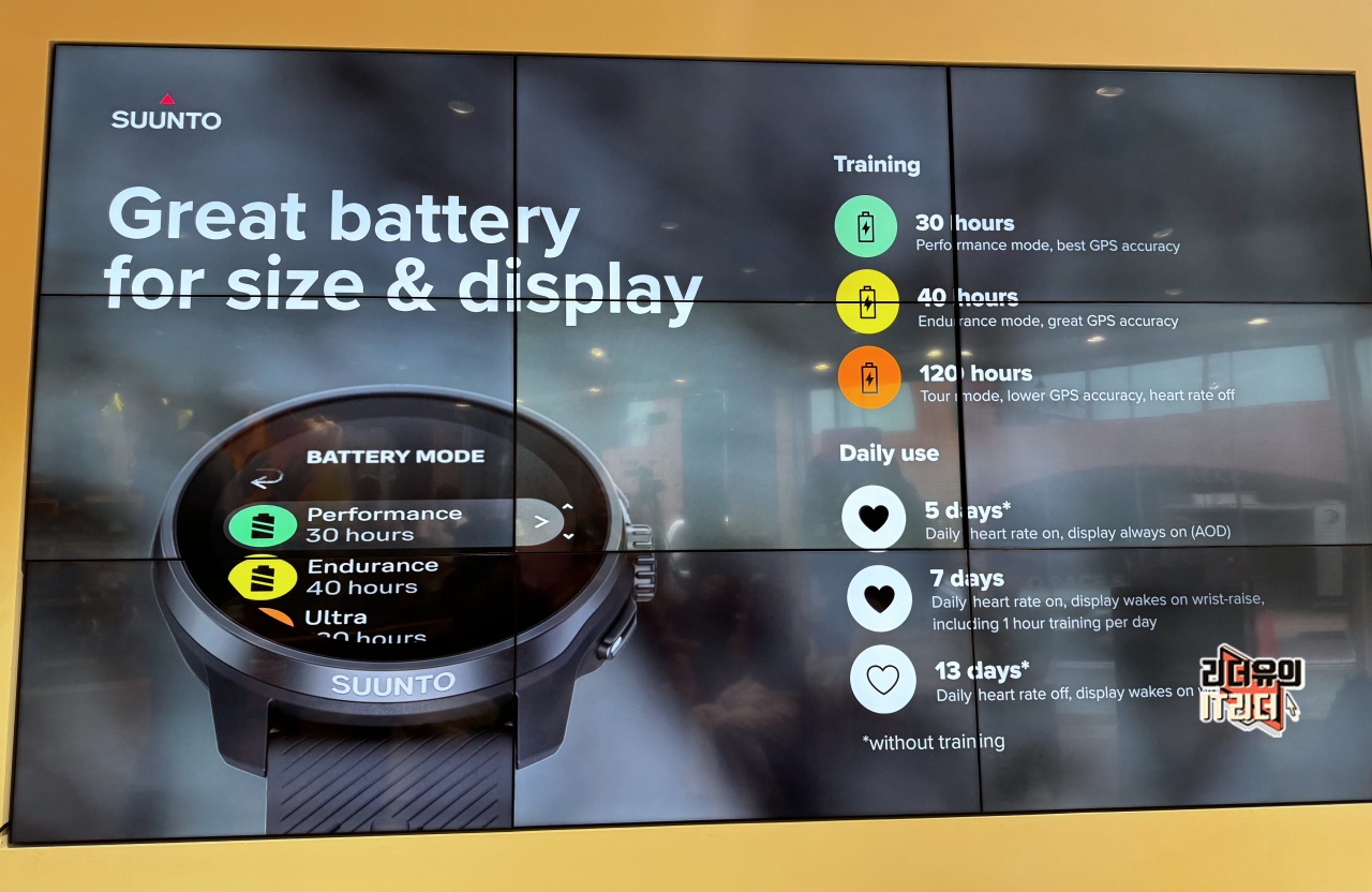 순토 레이스S 사용시간은 여전히 압도적입니다. 듀얼GPS를 사용하면서도 30시간 연속 사용이 가능하고 조금 낮아진 GPS모드를 사용하면 40시간, 더 낮은 GPS 모드를 사용하면 120시간 사용이 가능합니다. 그리고 일반 사용시 AOD를 켜고도 무려 5일이나 사용할 수 있는 배터리 타임을 가지고 있습니다.