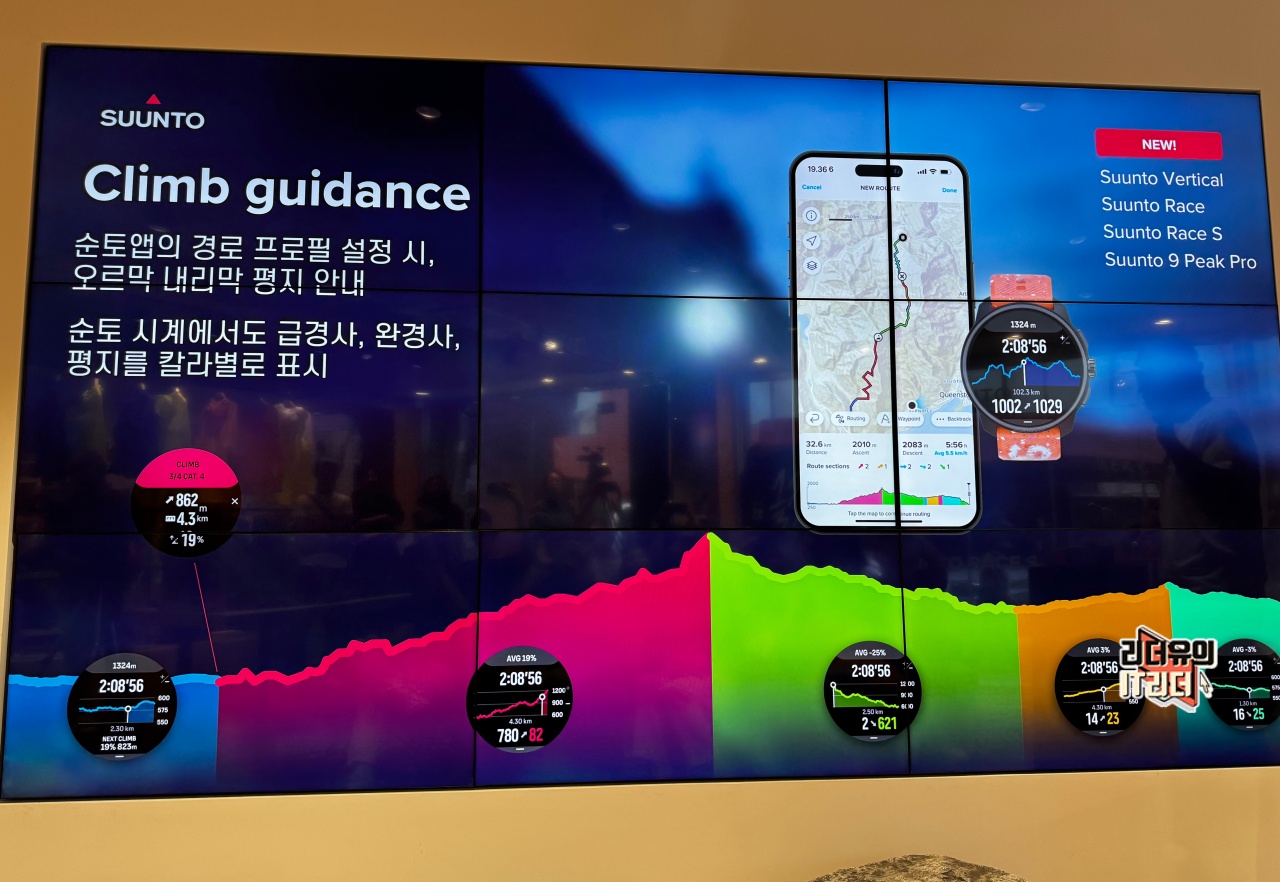 그리고 순토 레이스S에서는 순토앱에서 경로 프로필 설정 시, 오르막 내리막 평지 안내를 색상으로 확인할 수 있습니다. 급경사, 완경사를 색상으로 확인이 가능해 마음의 준비를 할 수 있습니다.