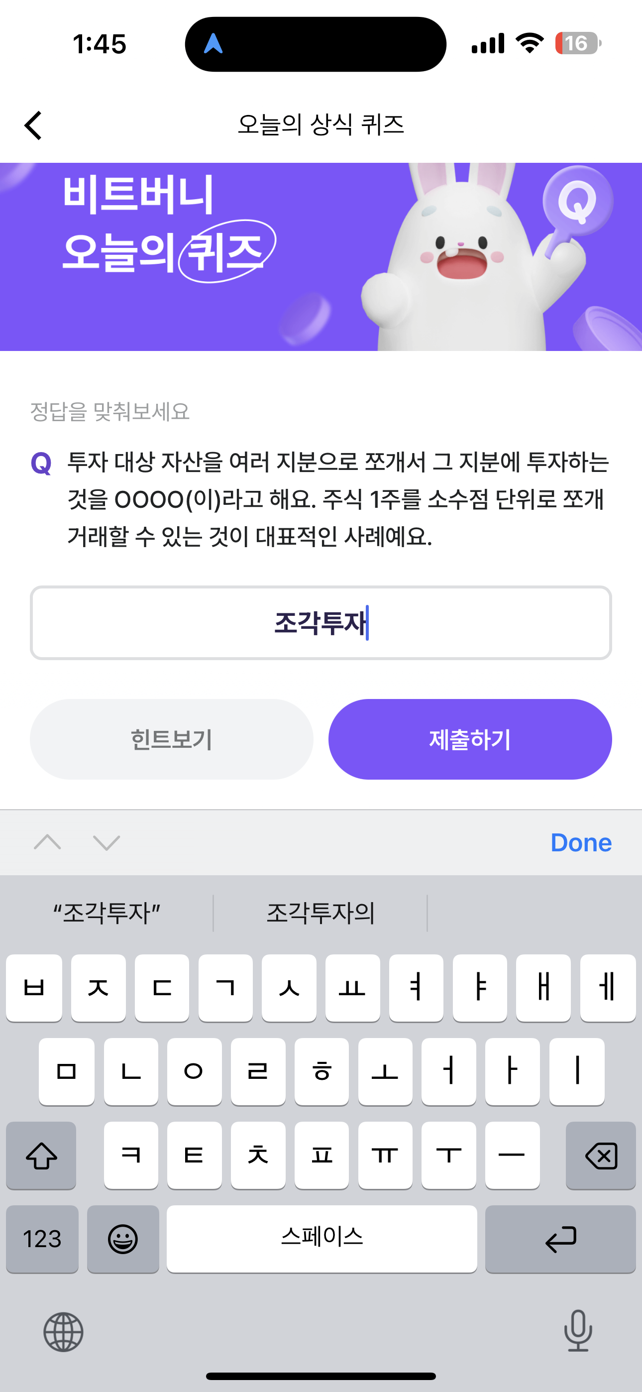 비트버니 오늘의 퀴즈 정답은 조각투자 입니다