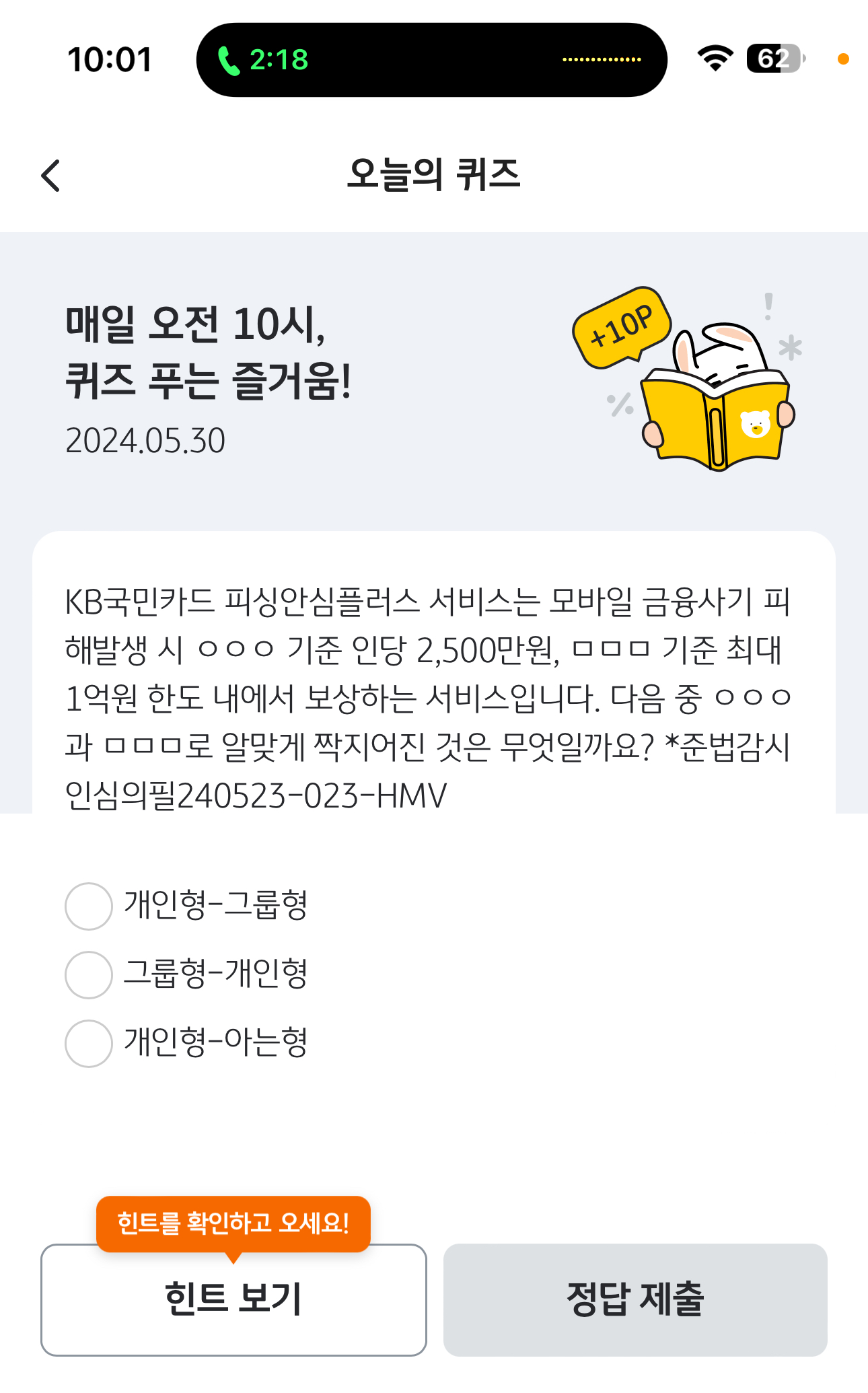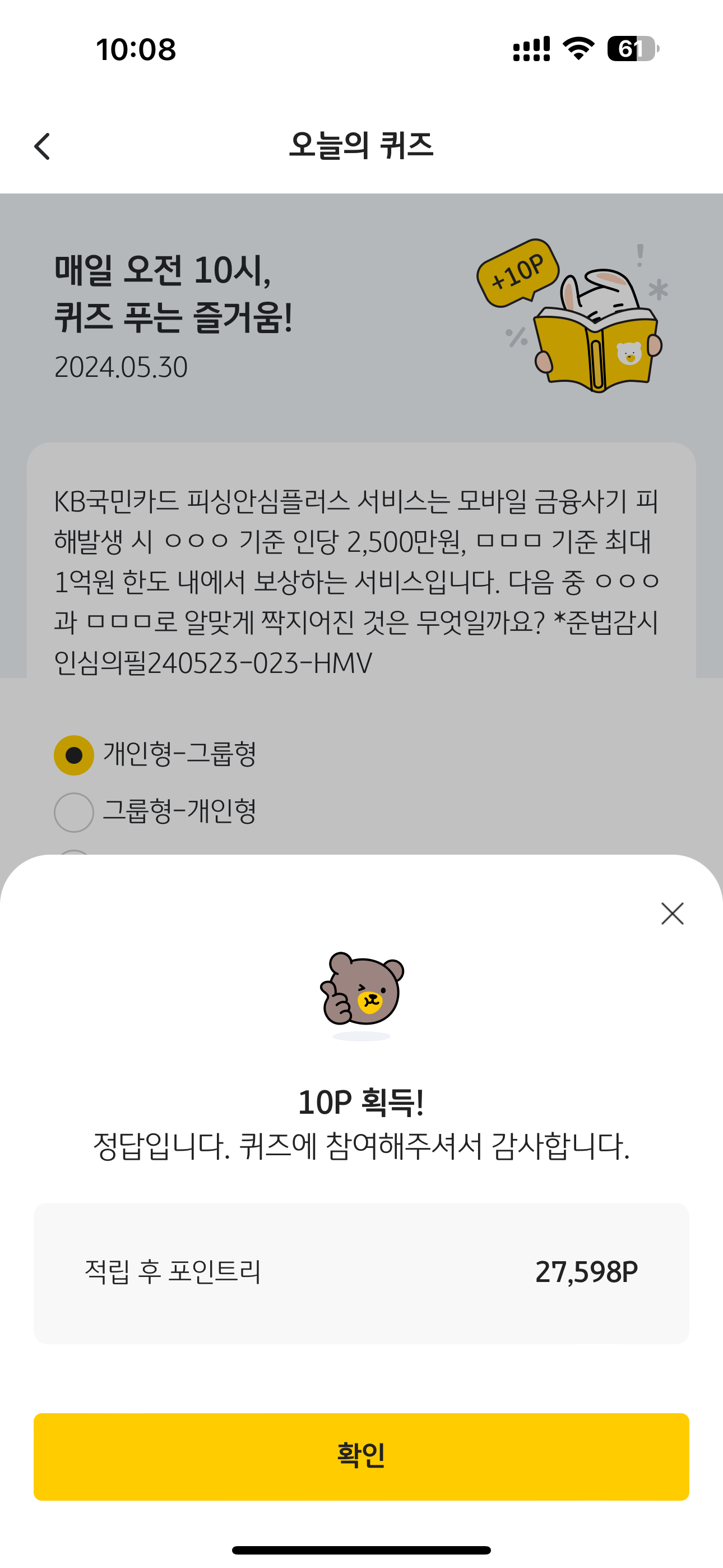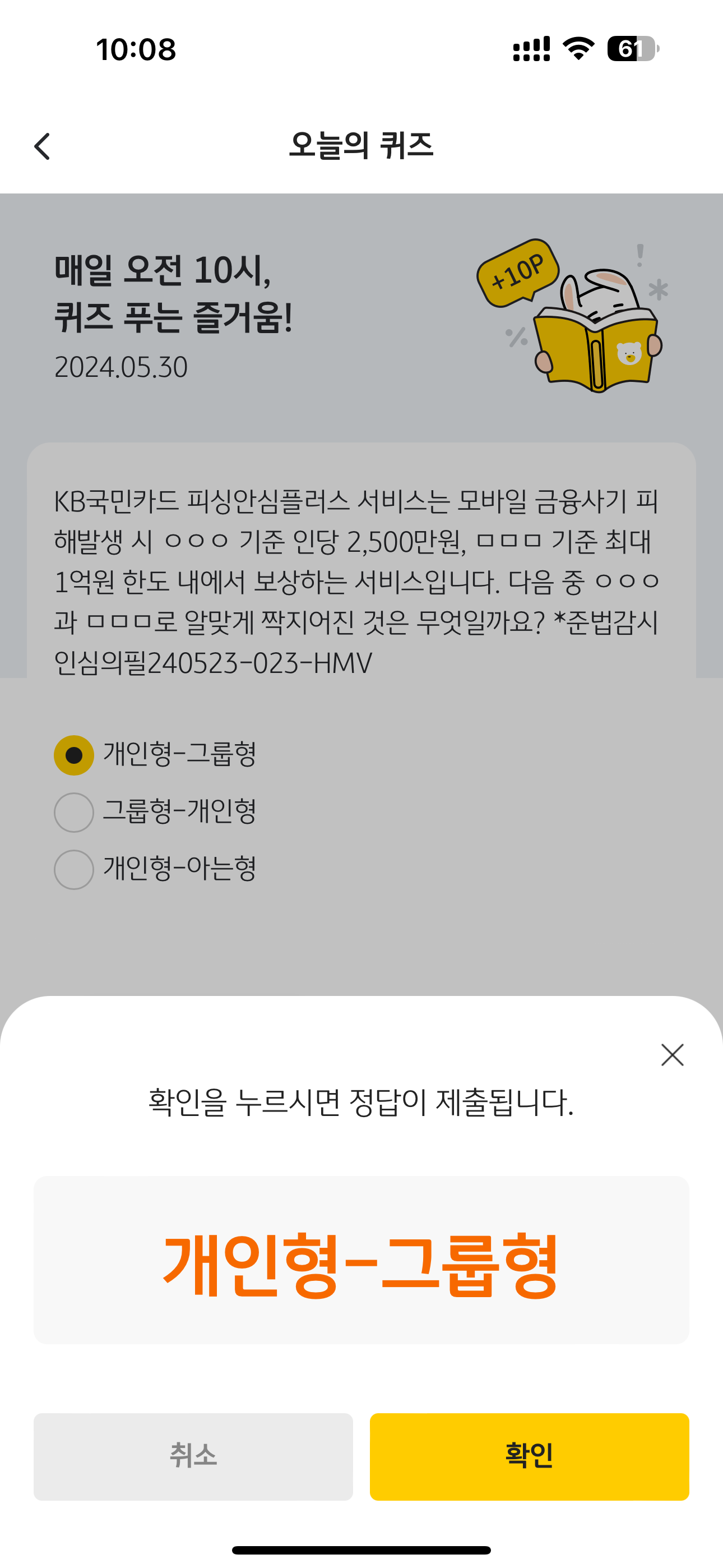 KB Pay 오늘의 퀴즈 정답은 개인형-그룹형 입니다