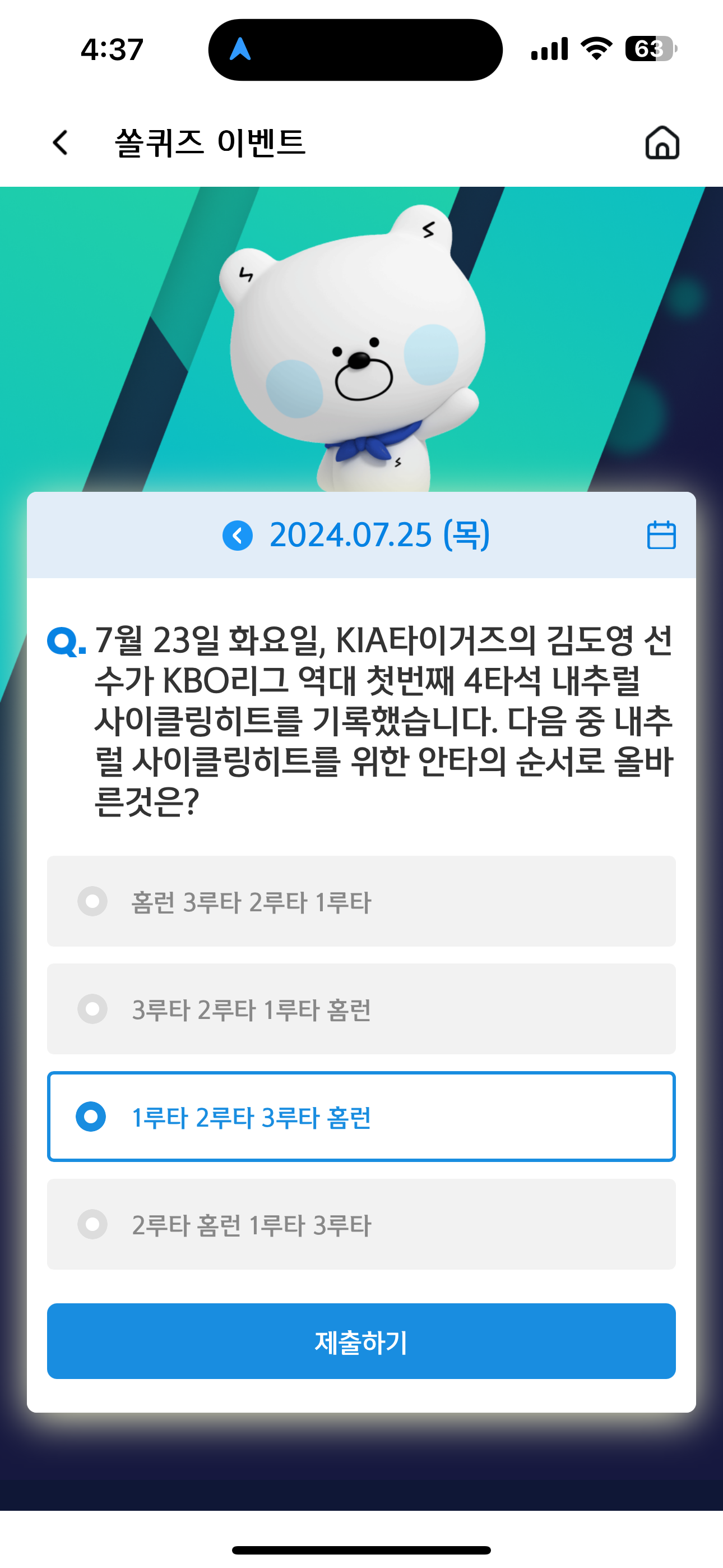 신한 슈퍼SOL 야구/상식 쏠퀴즈 7월 25일 정답(7월 23일 화요일, KIA타이거즈의 김도영 선수가 KBO리그 역대 첫번째 4타석 내추럴 사이클링히트를 기록했습니다)