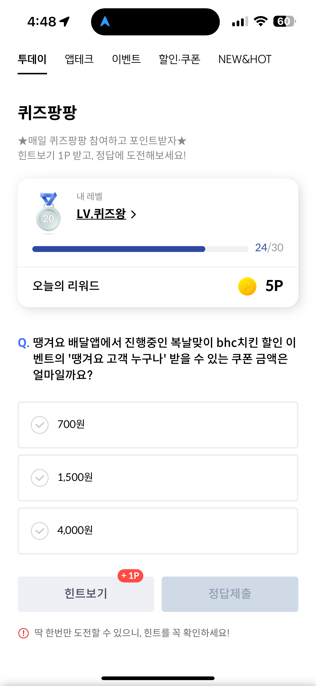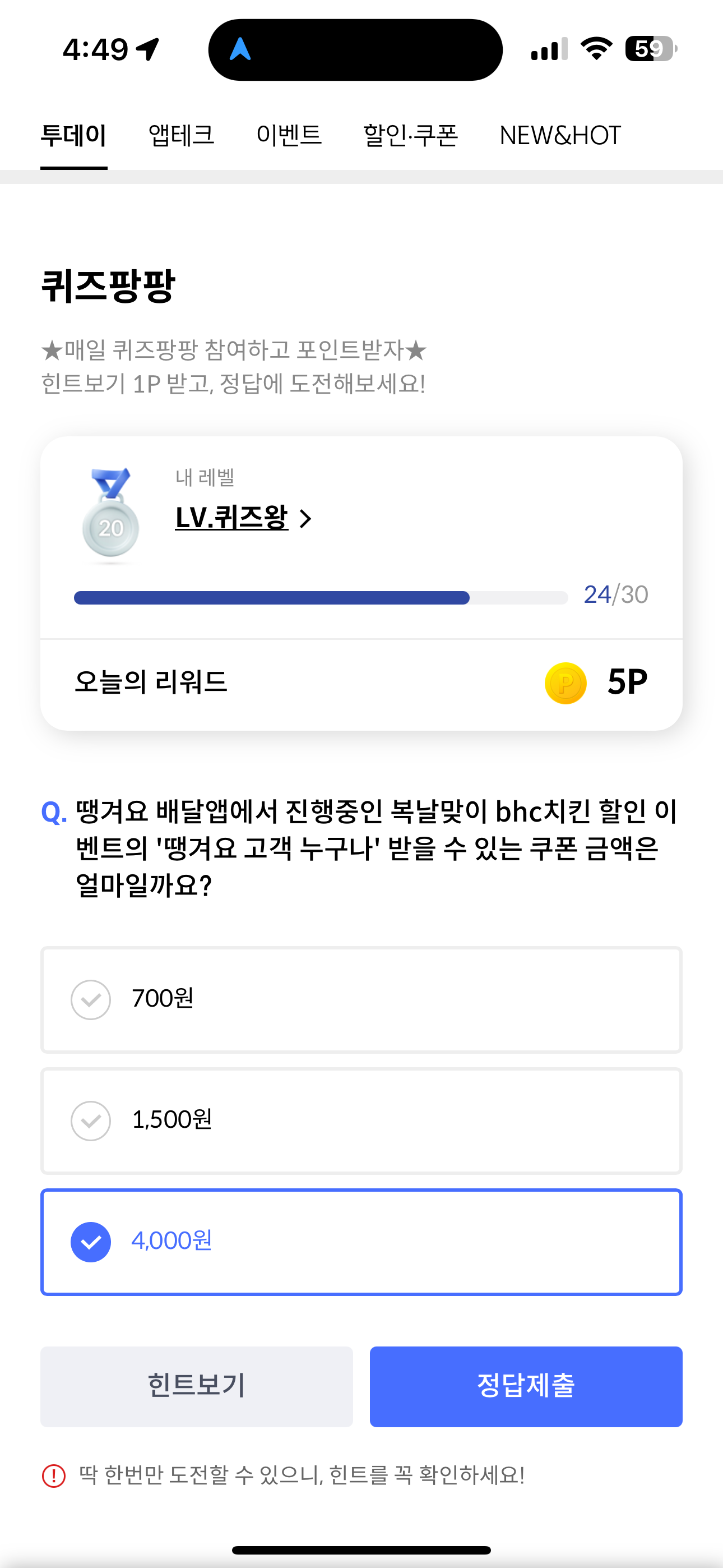 땡겨요 배달앱에서 진행중인 복날맞이 bhc치킨 할인 이벤트의 '땡겨요 고객 누구나' 받을 수 있는 쿠폰 금액은 얼마일까요? 보기는 1. 700원 2. 1,500원 3. 4,000원 입니다. 복날맞이 bhc치킨 할인을 파격적으로 하고 있습니다. 누구나 받을 수 있는 쿠폰 뿐만 아니라 추가 혜택도 있으니 참고해 두세요