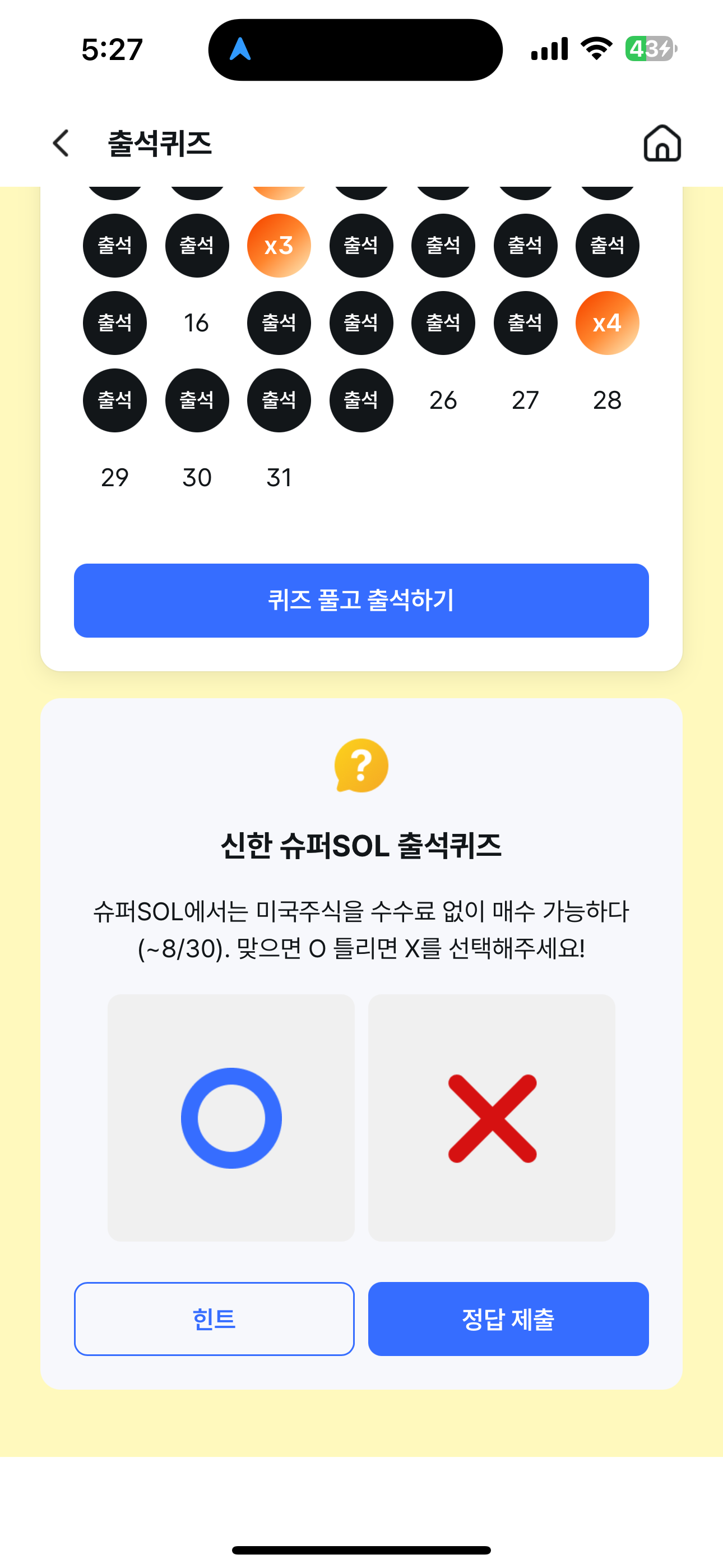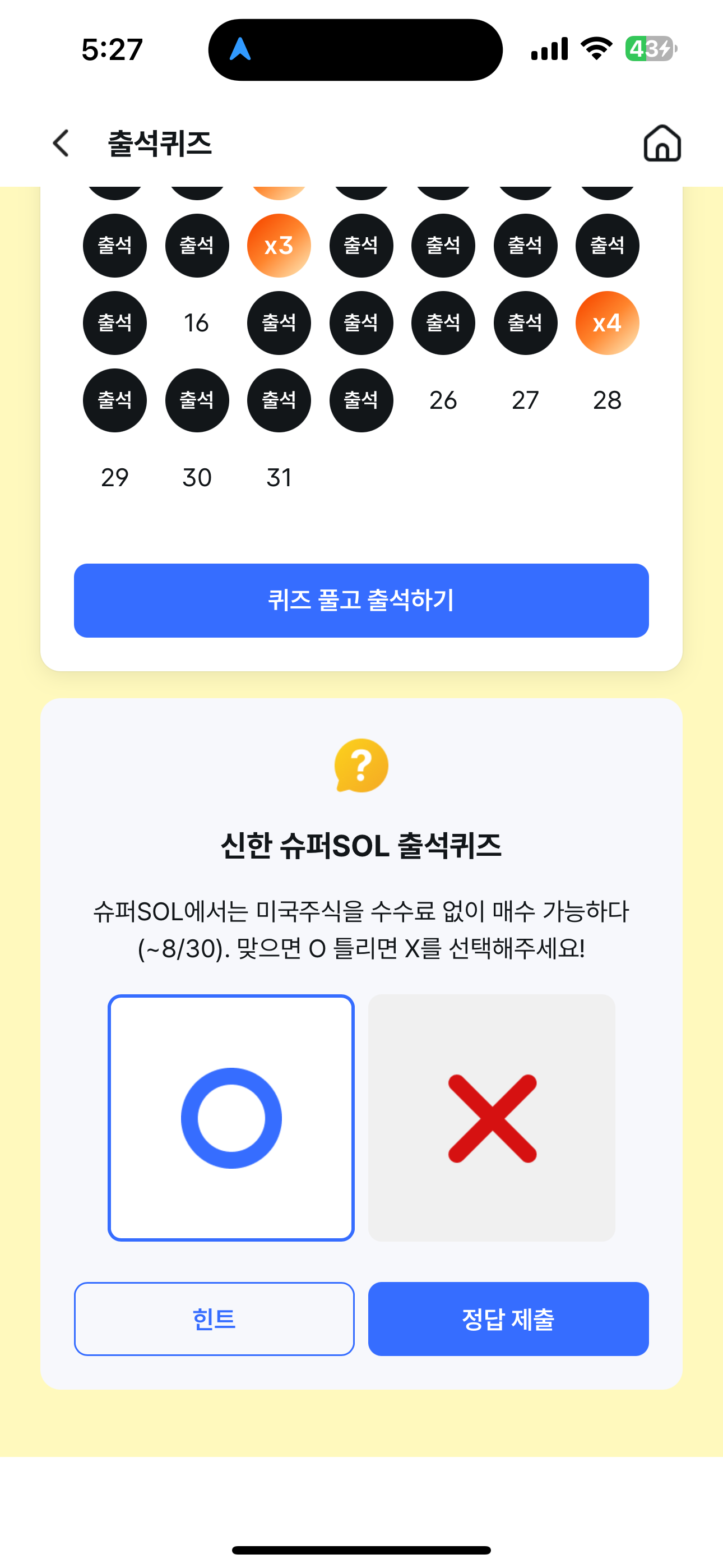신한 슈퍼SOL 출석퀴즈 정답은 O 입니다