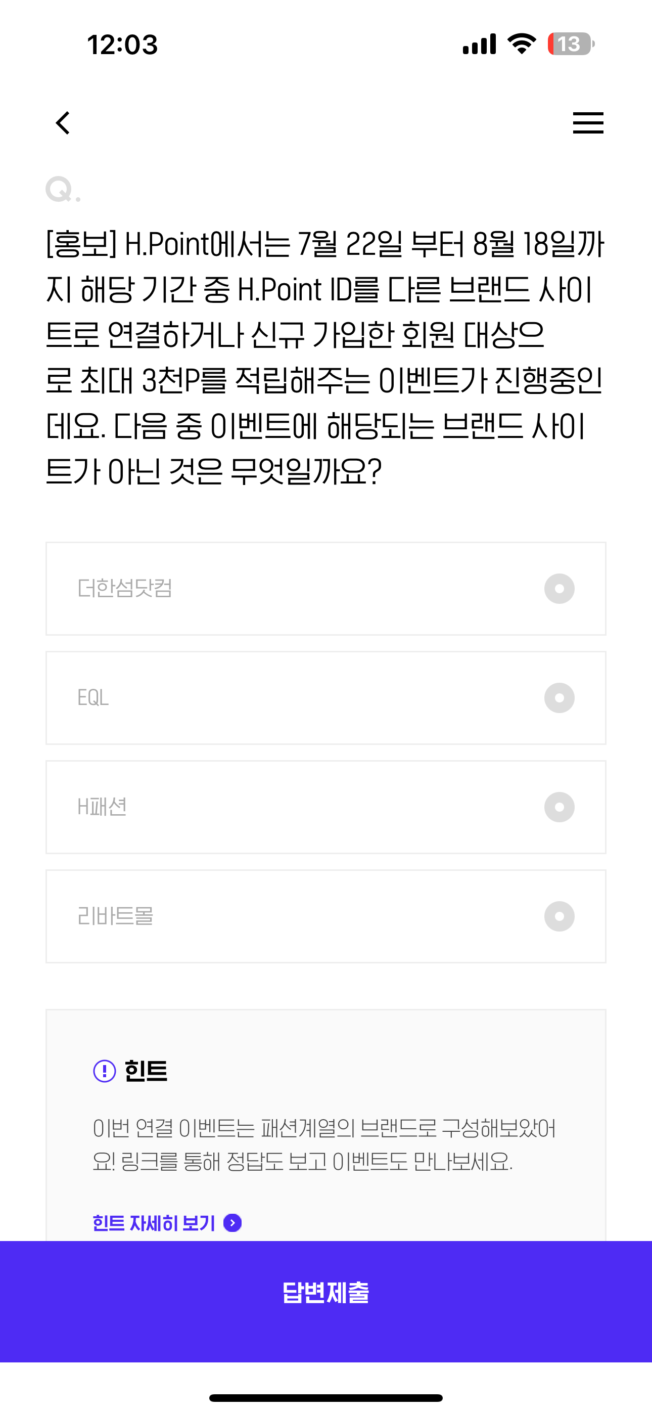 [홍보] H.Point에서는 7월 22일 부터 8월 18일까지 해당 기간 중 H.Point ID를 다른 브랜드 사이트로 연결하거나 신규 가입한 회원 대상으로 최대 3천P를 적립해주는 이벤트가 진행중인데요. 다음 중 이벤트에 해당되는 브랜드 사이트가 아닌 것은 무엇일까요? 보기는 1. 더한섬닷컴 2. EQL 3. H패션 4. 리바트몰 입니다.