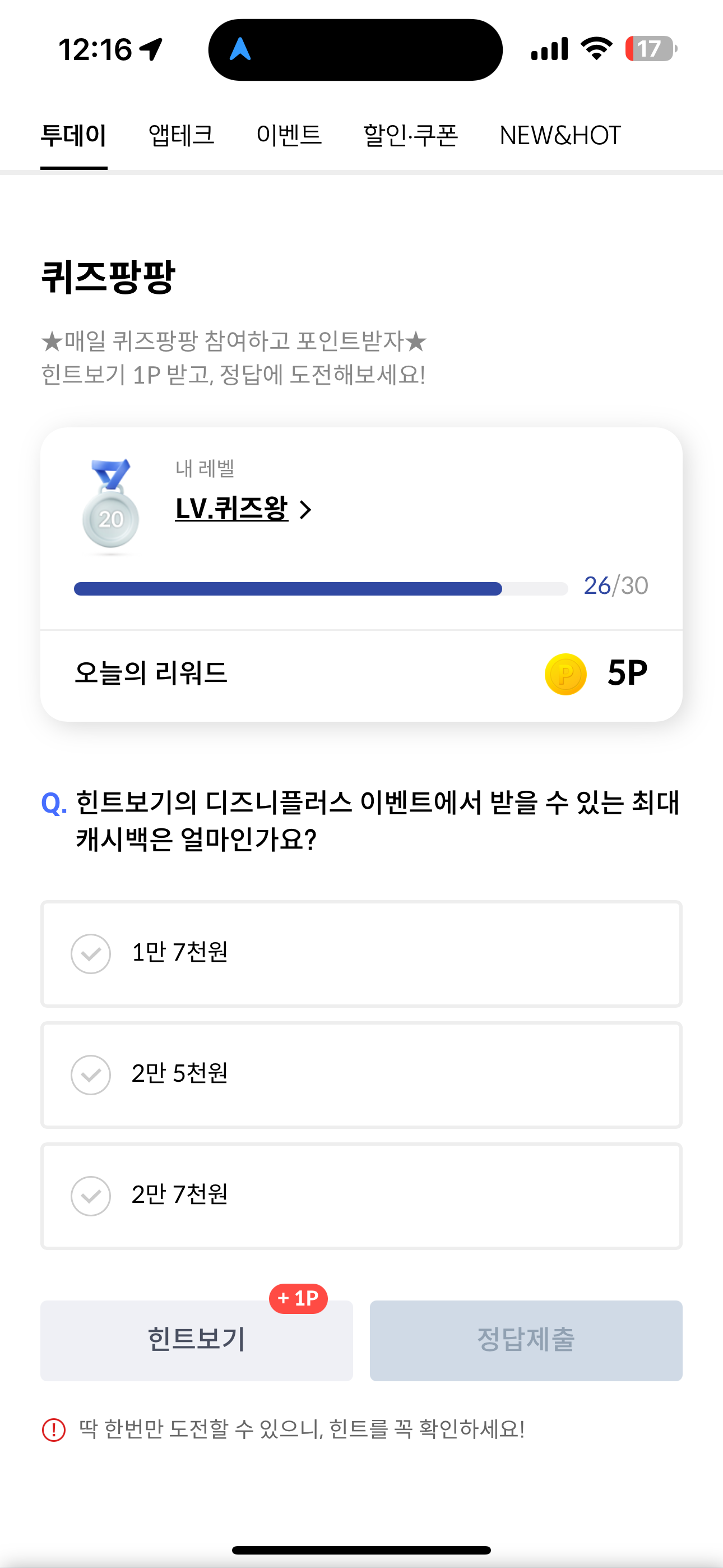 신한카드 퀴즈팡팡 7월 27일 정답(힌트보기의 디즈니플러스 이벤트에서 받을 수 있는 최대 캐시백은 얼마인가요?)