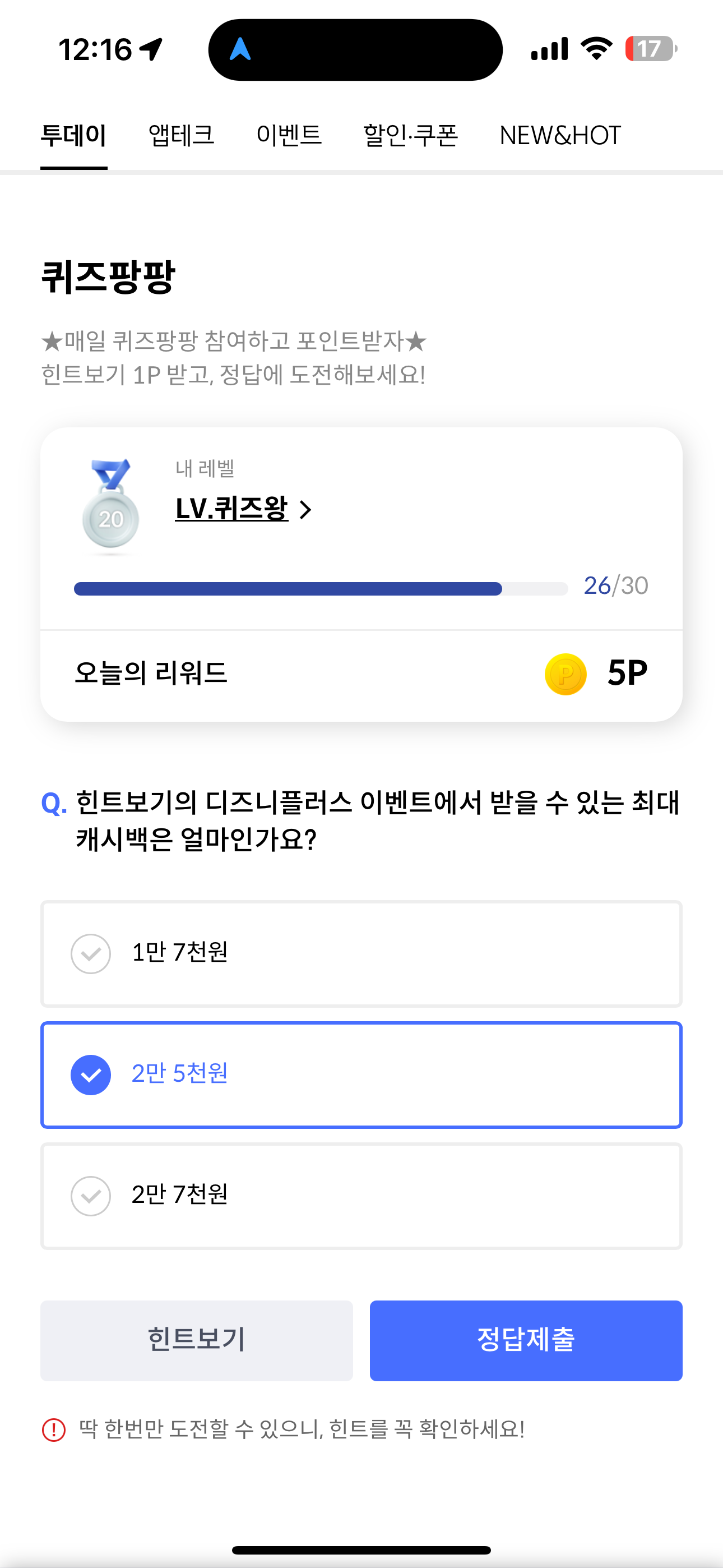 힌트보기의 디즈니플러스 이벤트에서 받을 수 있는 최대 캐시백은 얼마인가요? 보기는 1. 1만 7천원 2. 2만 5천원 3. 2만 7천원 입니다. 디즈니플러스는 국내 시장에서 힘을 내지 못하고 있어 파격적인 이벤트를 걸고 있습니다. 디즈니플러스 이용을 고민중이신 분들은 캐시백 받고 저렴하게 이용하는게 진리입니다.