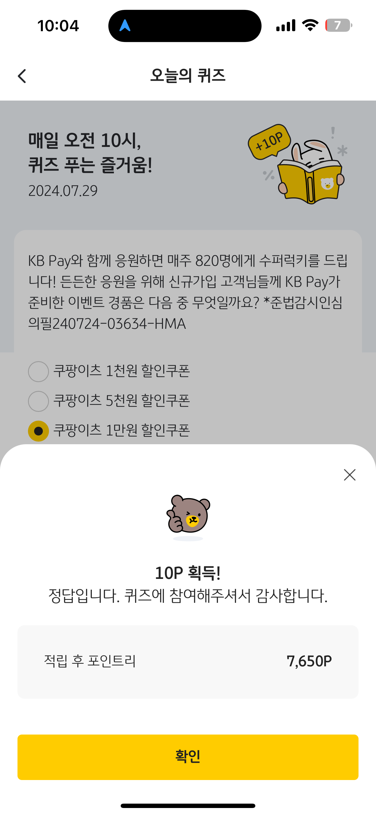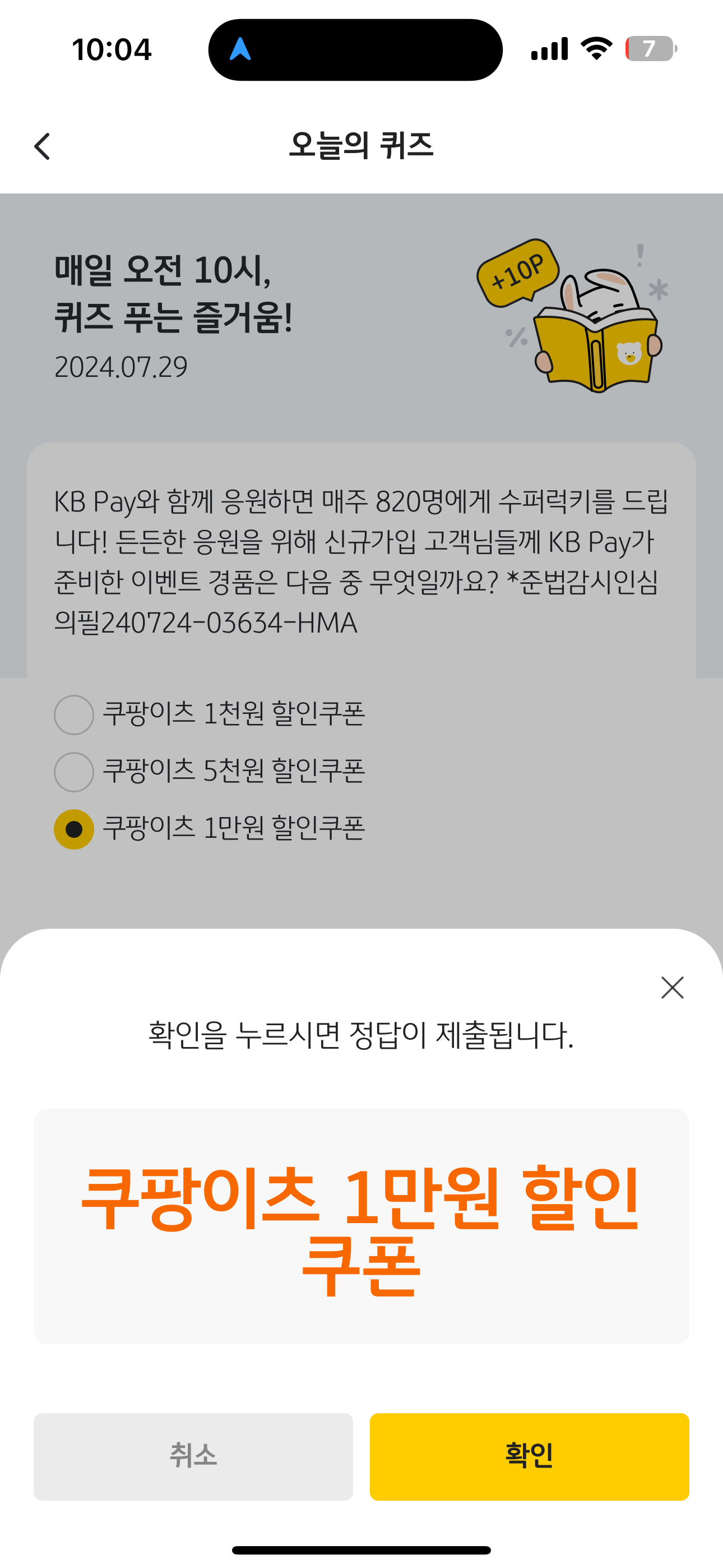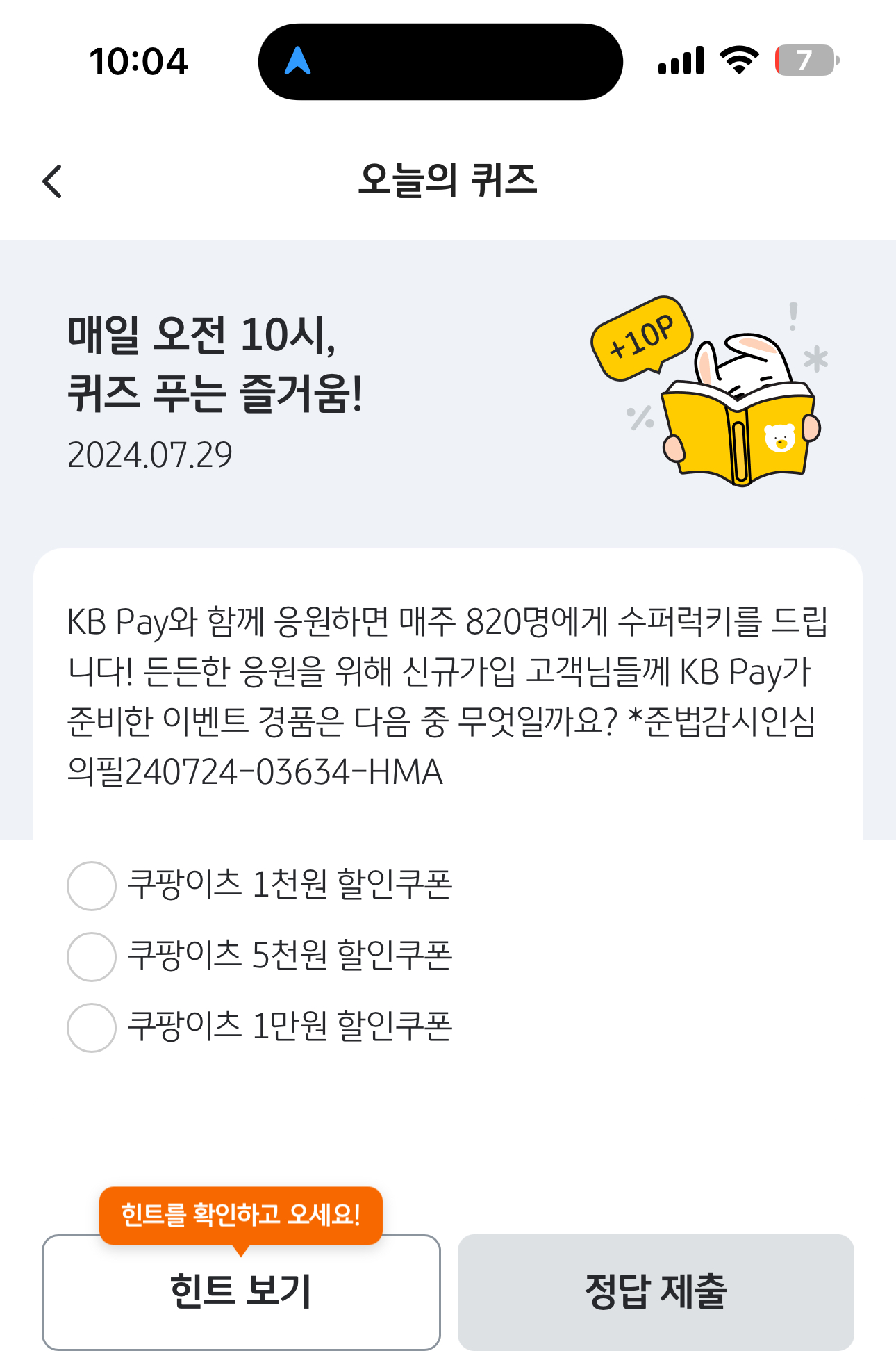 KB Pay 오늘의 퀴즈 정답은 쿠팡이츠 1만원 할인 쿠폰 입니다