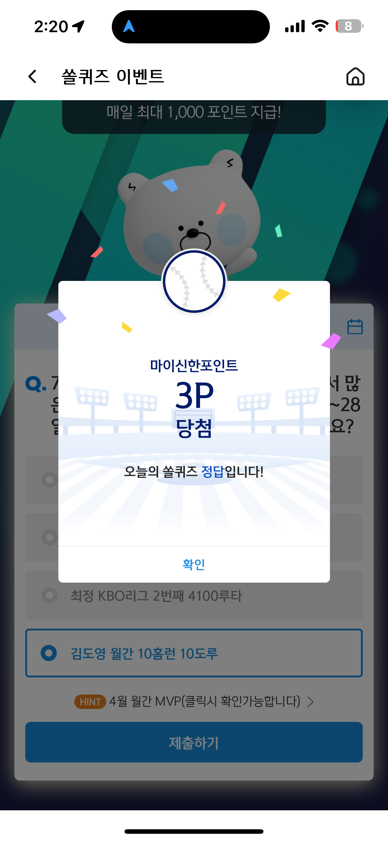 신한 슈퍼SOL 야구/상식 쏠퀴즈 정답은 김도영 월간 10홈런 10도루 입니다
