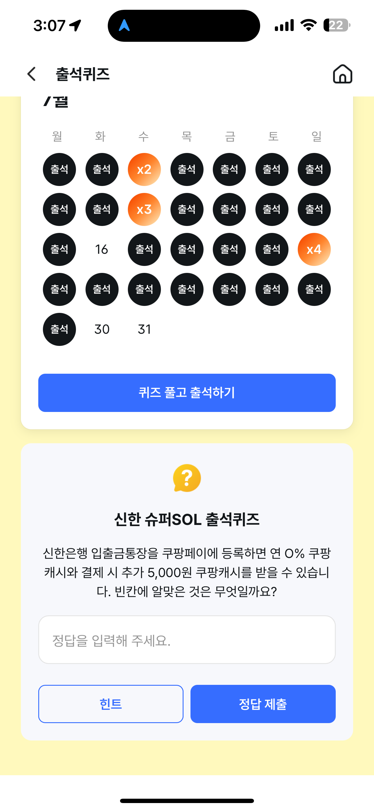 신한 슈퍼SOL 출석퀴즈 7월 30일 정답(신한은행 입출금통장을 쿠팡페이에 등록하면 연 O% 쿠팡캐시와 결제 시 추가 5,000원 쿠팡캐시를 받을 수 있습니다.)