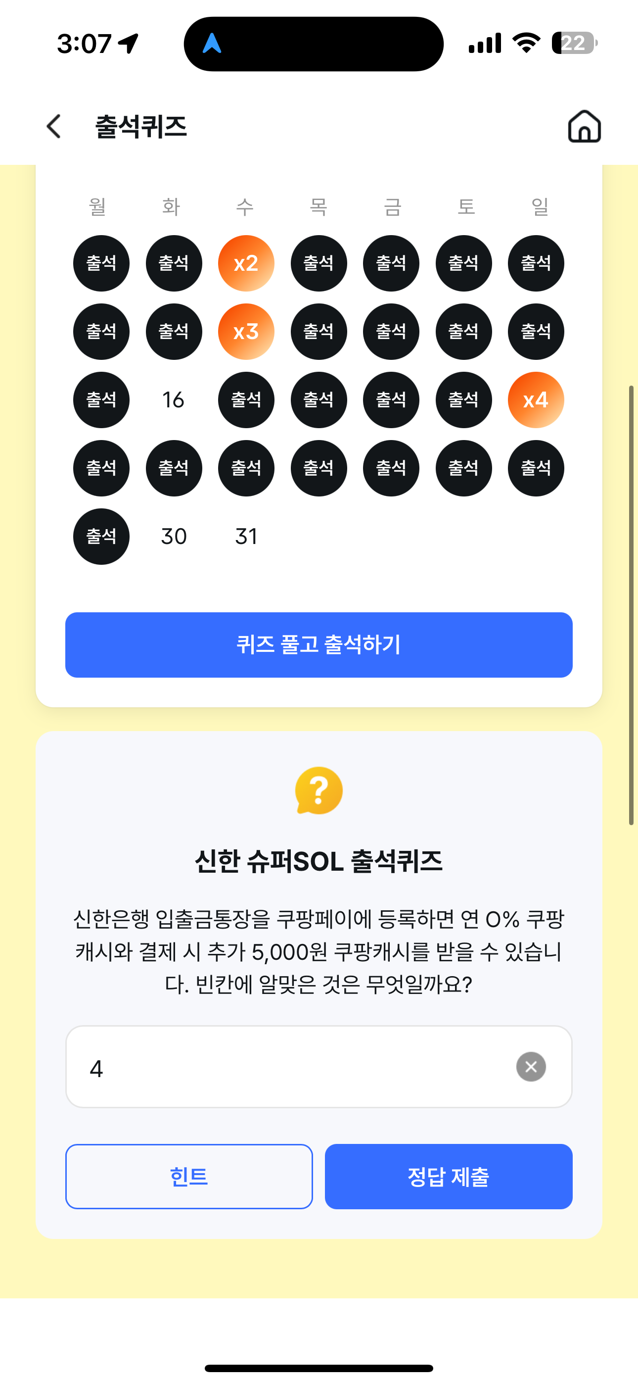 신한 슈퍼SOL 출석퀴즈 정답은 4 입니다