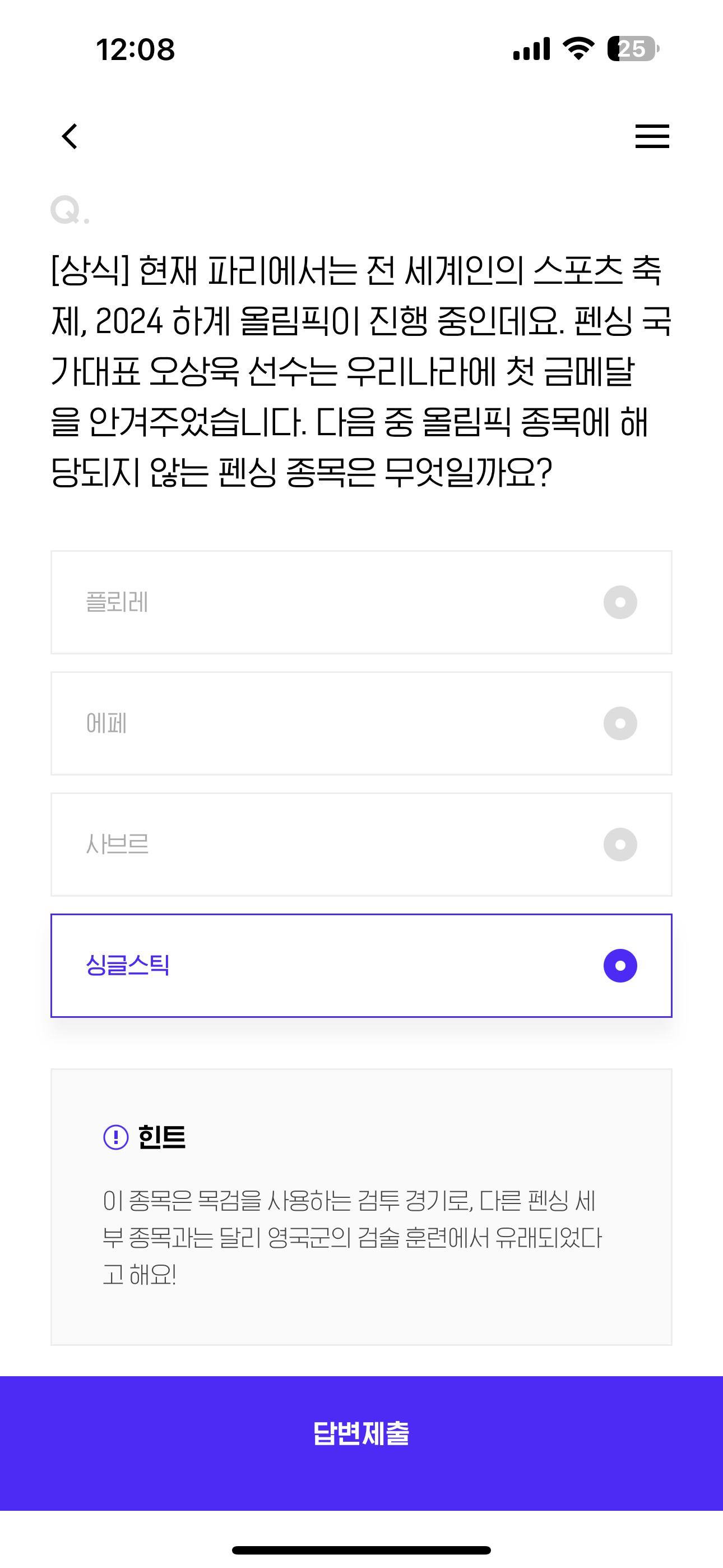 [상식] 현재 파리에서는 전 세계인의 스포츠 축제, 2024 하계 올림픽이 진행 중인데요. 펜싱 국가대표 오상욱 선수는 우리나라에 첫 금메달을 안겨주었습니다. 다음 중 올림픽 종목에 해당되지 않는 펜싱 종목은 무엇일까요? 보기는 1. 플뢰레 2. 에페 3. 사브르 4. 싱글스틱 입니다.