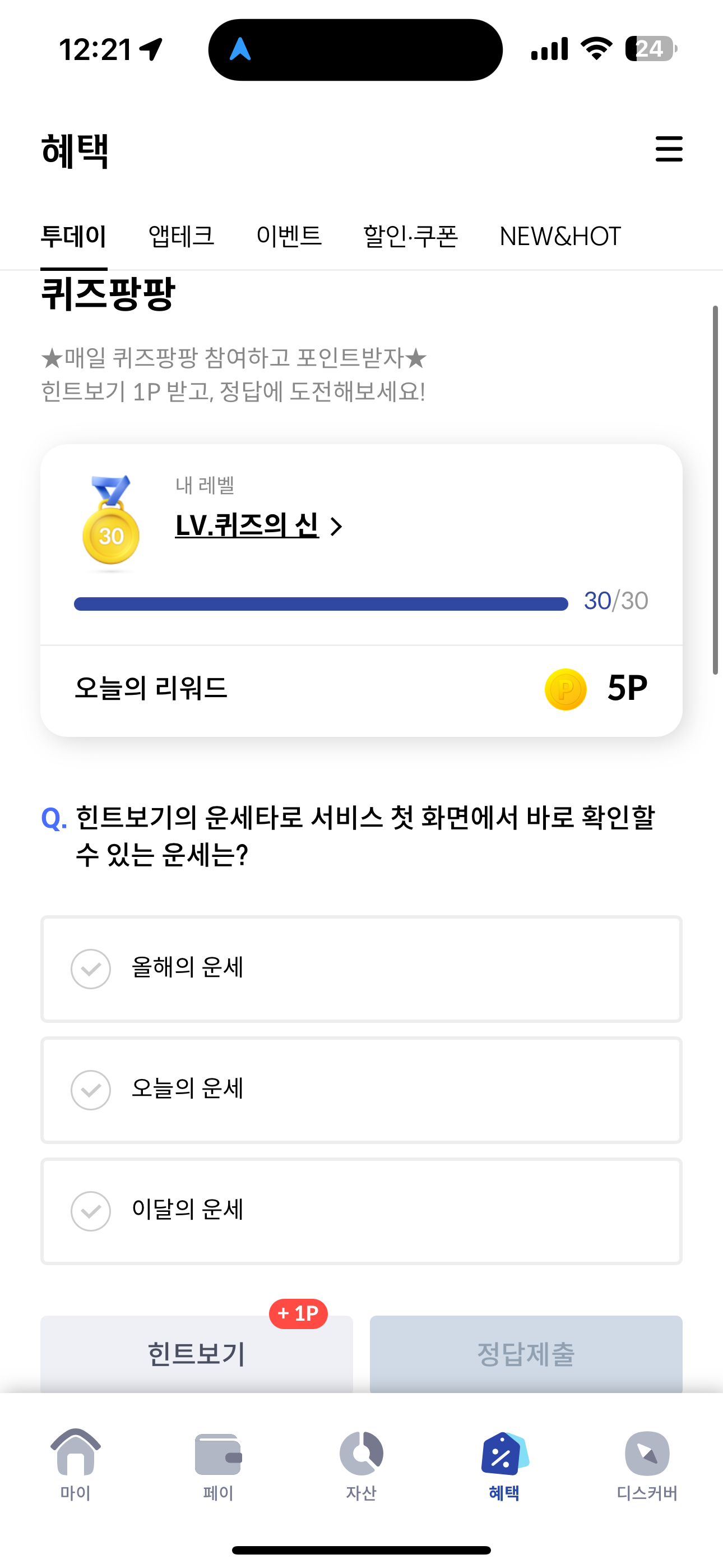 신한카드 퀴즈팡팡 정답은 오늘의 운세 입니다