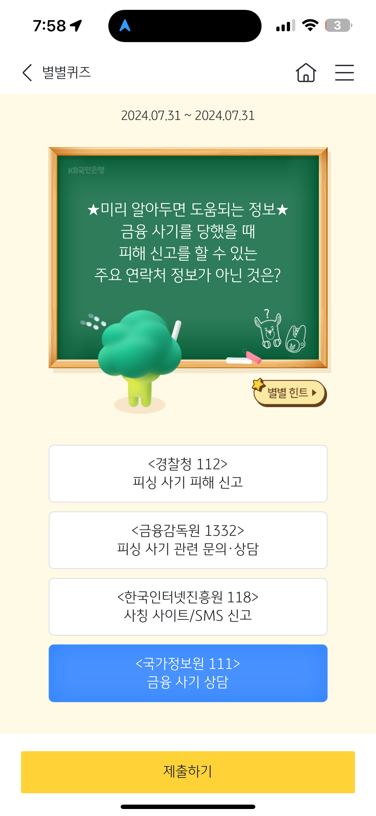 KB스타뱅킹 별별퀴즈 정답은 <국가정보원 111>금융 사기 상담 입니다