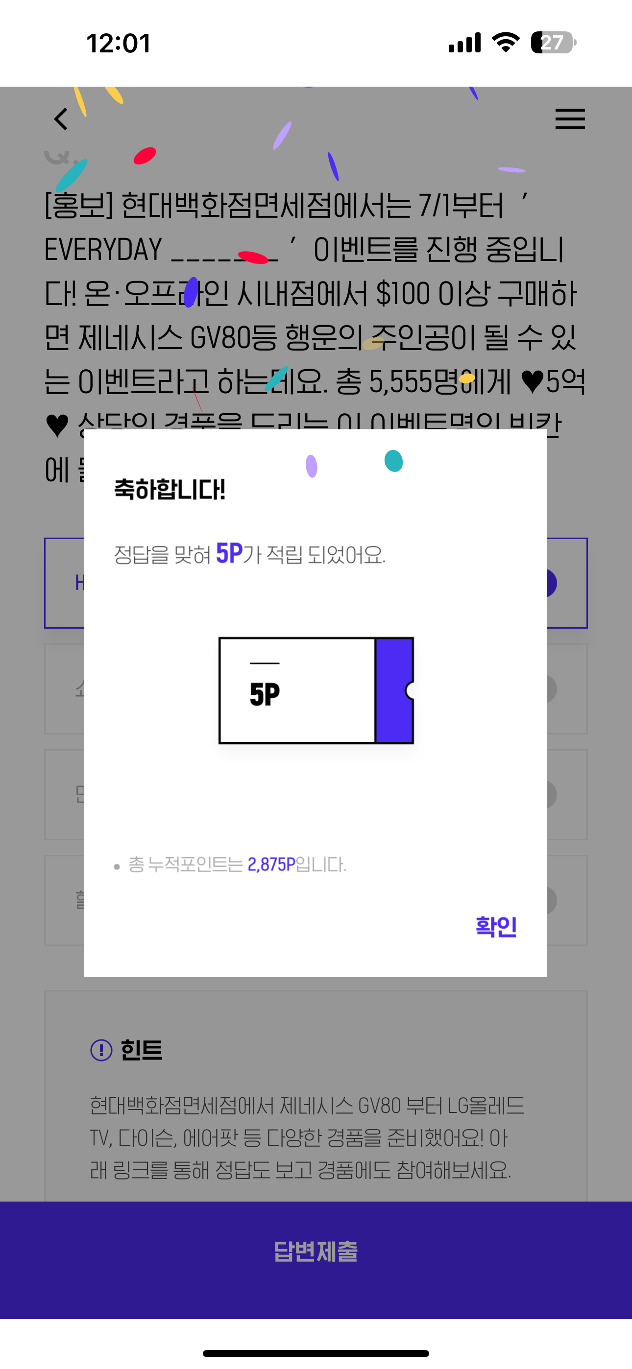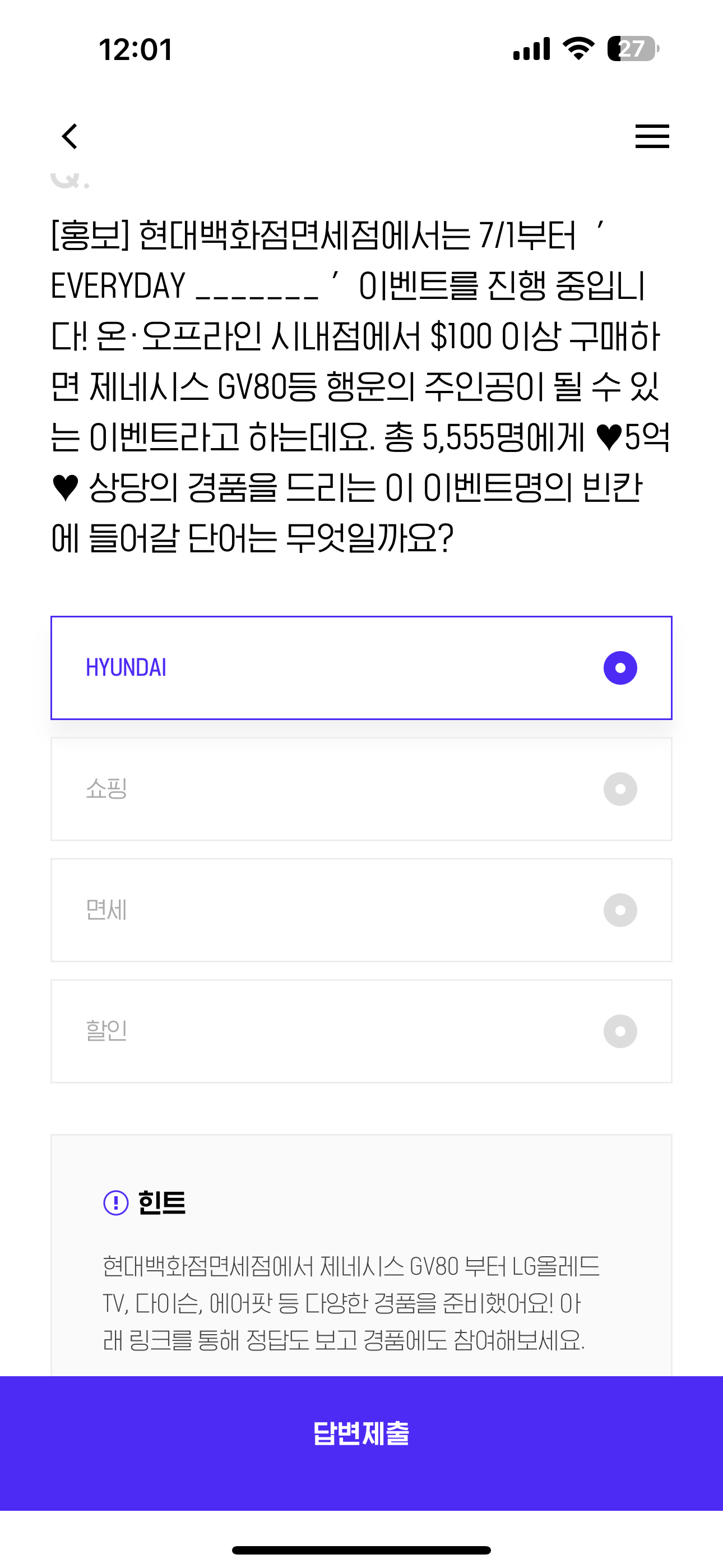 H포인트 퀴즈 정답은 HYUNDAI 입니다