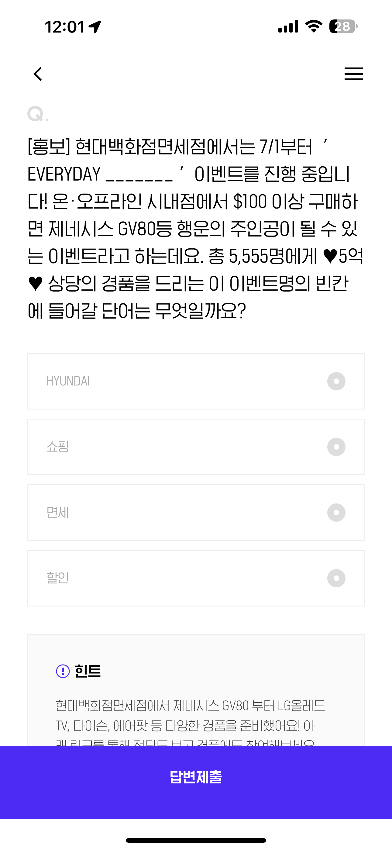 현대백화점면세점에서는 7/1부터 ' EVERYDAY _______ ' 이벤트를 진행 중입니다! 온 오프라인 시내점에서 $100 이상 구매하면 제네시스 GV80등 행운의 주인공이 될 수 있는 이벤트라고 하는데요. 총 5,555명에게 ♥5억♥ 상당의 경품을 드리는 이 이벤트명의 빈칸에 들어갈 단어는 무엇일까요? 보기는 1. HYUNDAI 2. 쇼핑 3. 면세 4. 할인 입니다