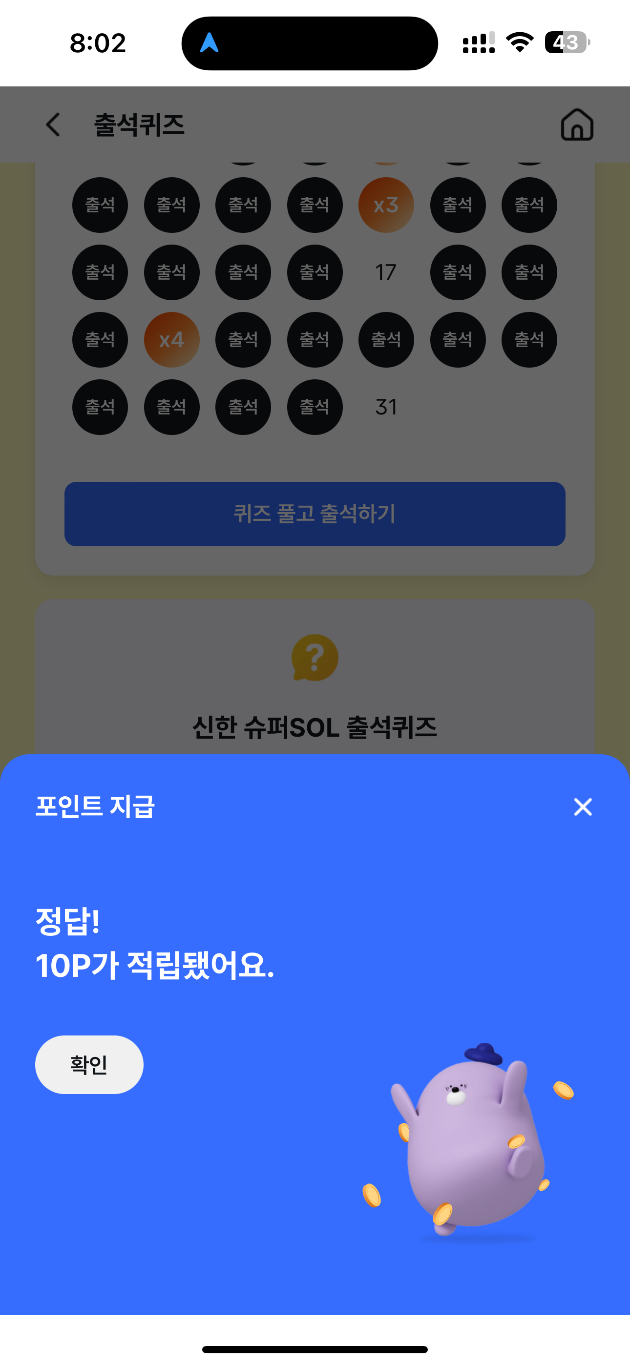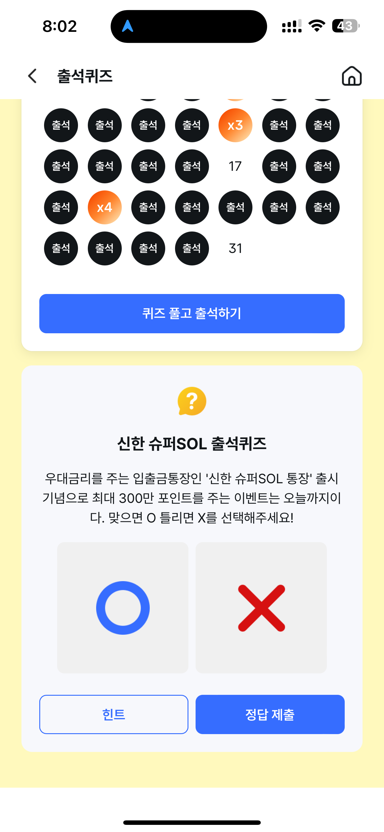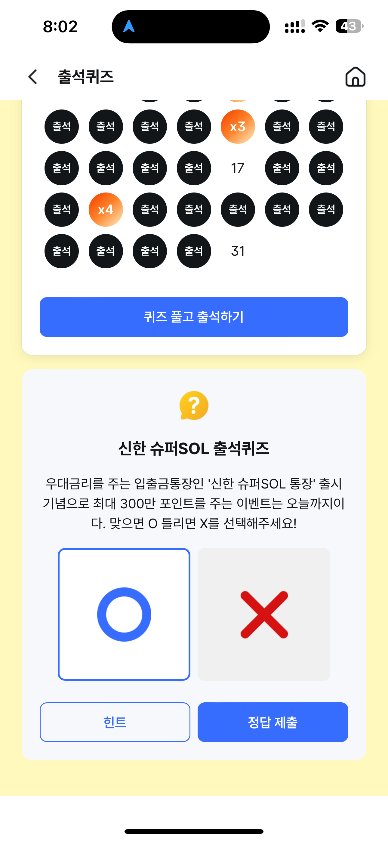 신한 슈퍼SOL 출석퀴즈 정답은 O 입니다