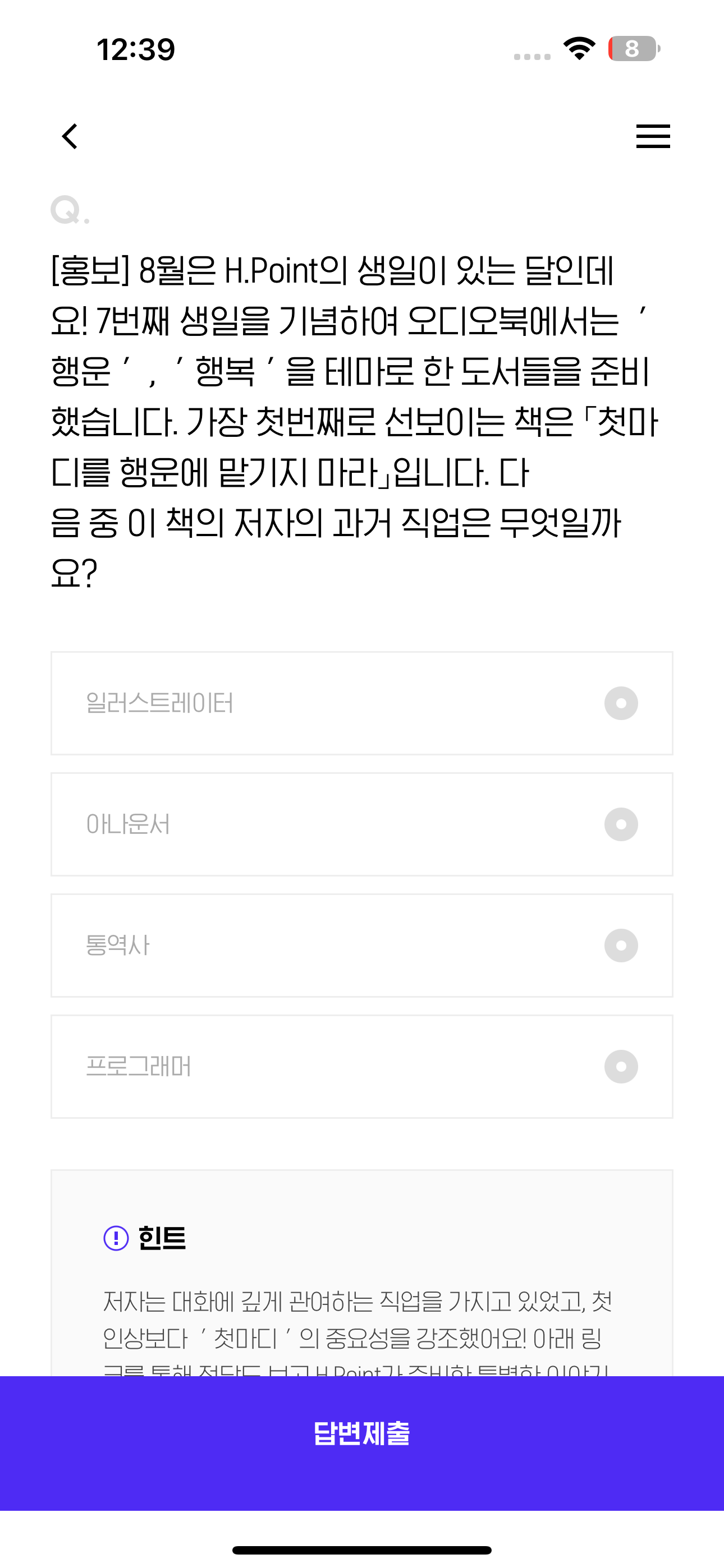8월은 H.Point의 생일이 있는 달인데요! 7번째 생일을 기념하여 오디오북에서는 ' 행운 ' , ' 행복 ' 을 테마로 한 도서들을 준비 했습니다. 가장 첫번째로 선보이는 책은 「첫마디를 행운에 맡기지 마라」입니다. 다음 중 이 책의 저자의 과거 직업은 무엇일까요? 보기는 1. 일러스트레이터 2. 아나운서 3. 통역사 4. 프로그래머 입니다.