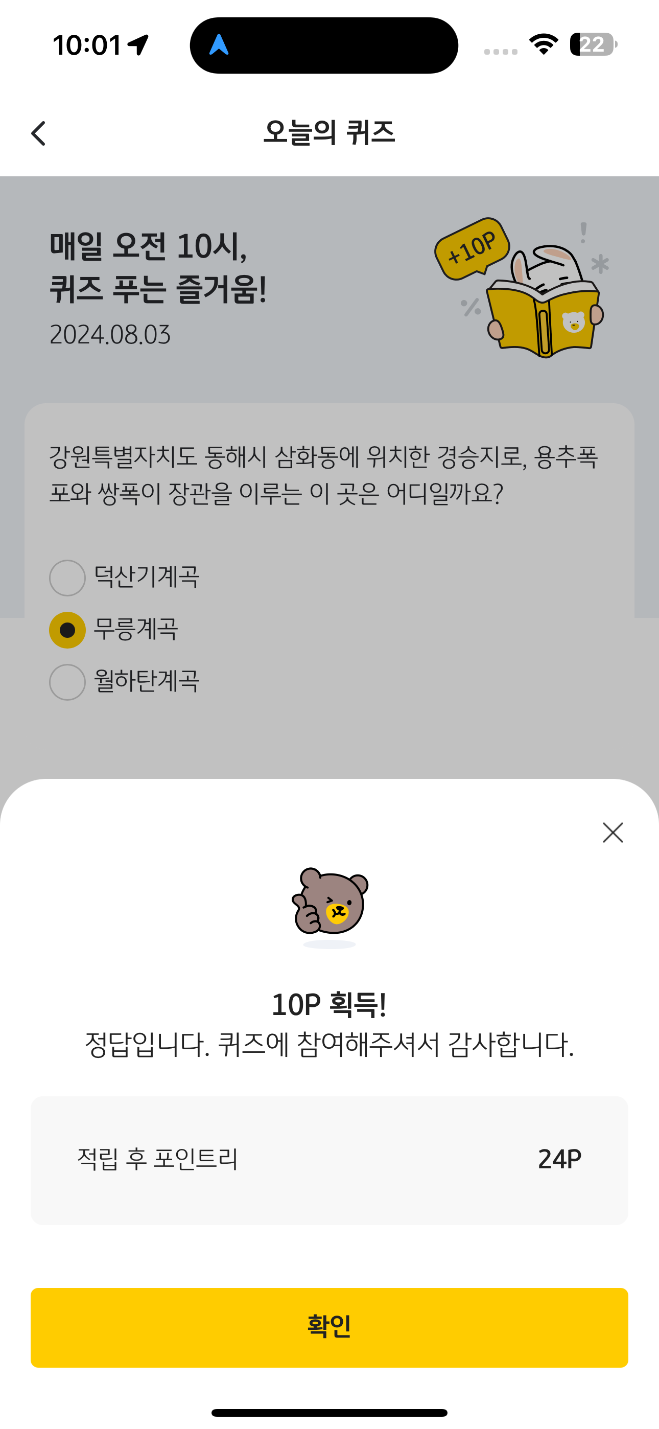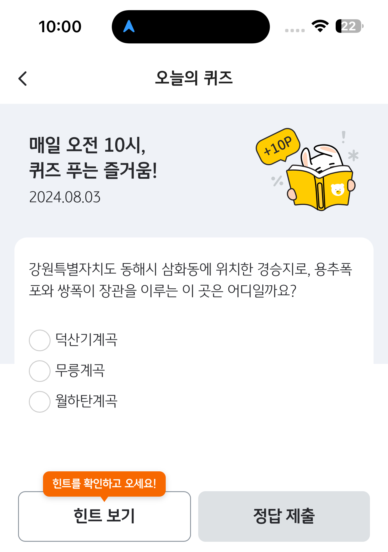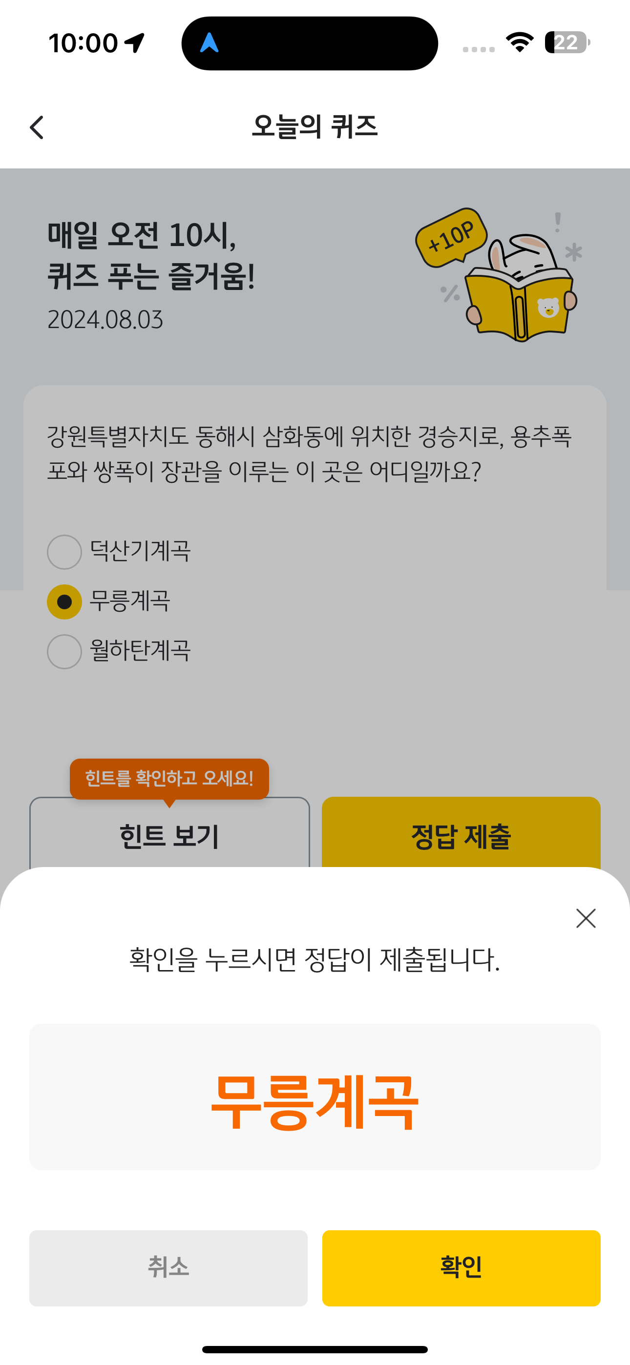 KB Pay 오늘의 퀴즈 8월 3일 정답(강원특별자치도 동해시 삼화동에 위치한 경승지로, 용추폭포와 쌍폭이 장관을 이루는 이 곳은 어디일까요?)
