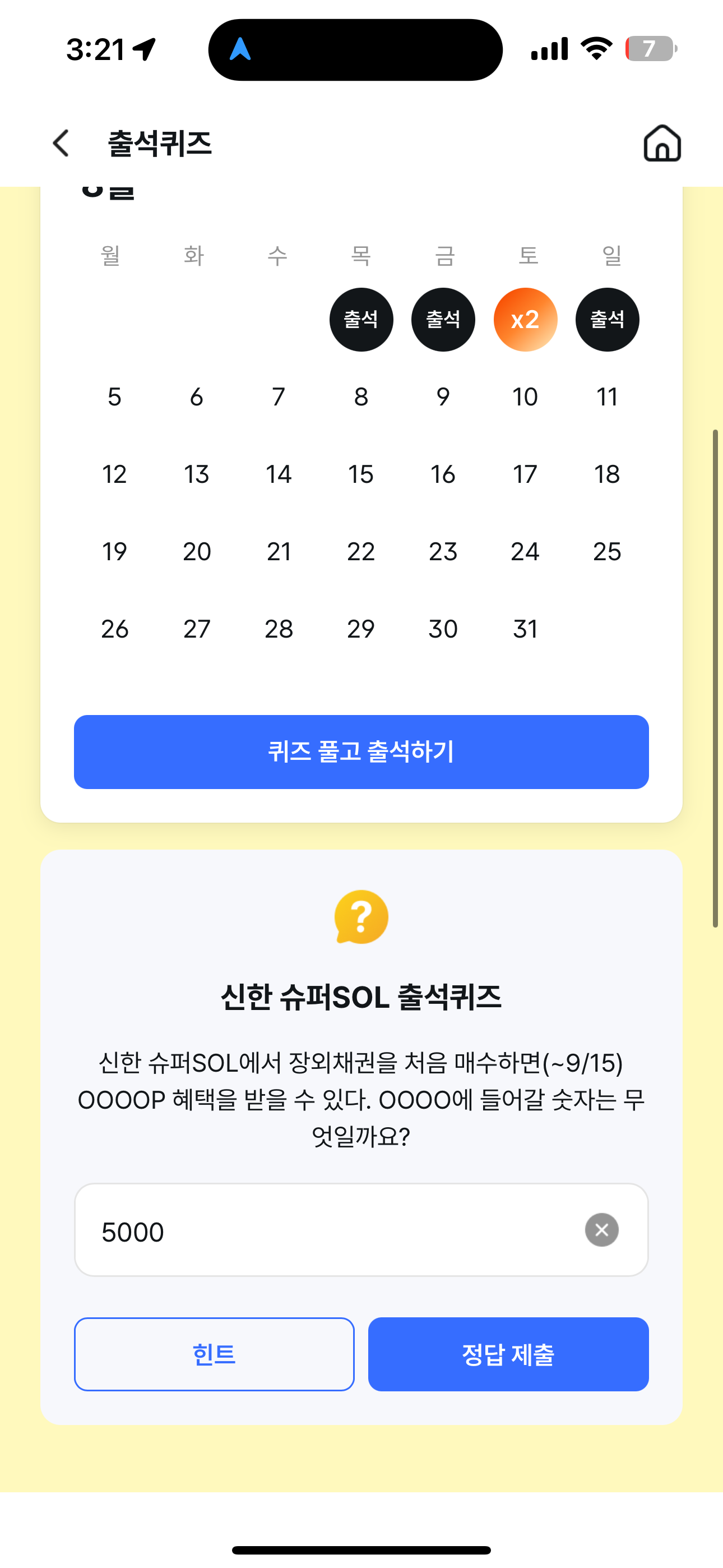 신한 슈퍼SOL 출석퀴즈 정답은 5000 입니다
