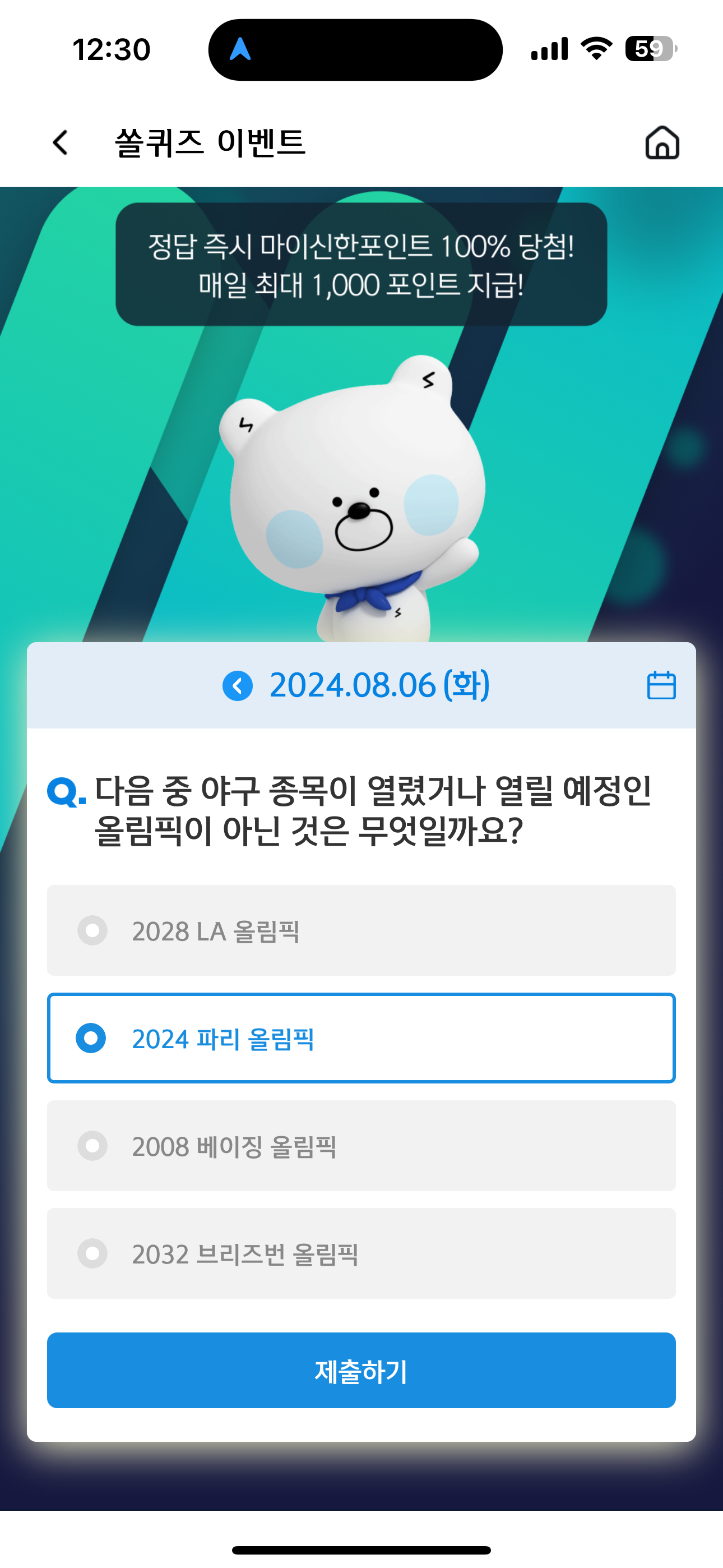 신한 슈퍼SOL 야구/상식 쏠퀴즈 정답은 2024 파리 올림픽 입니다
