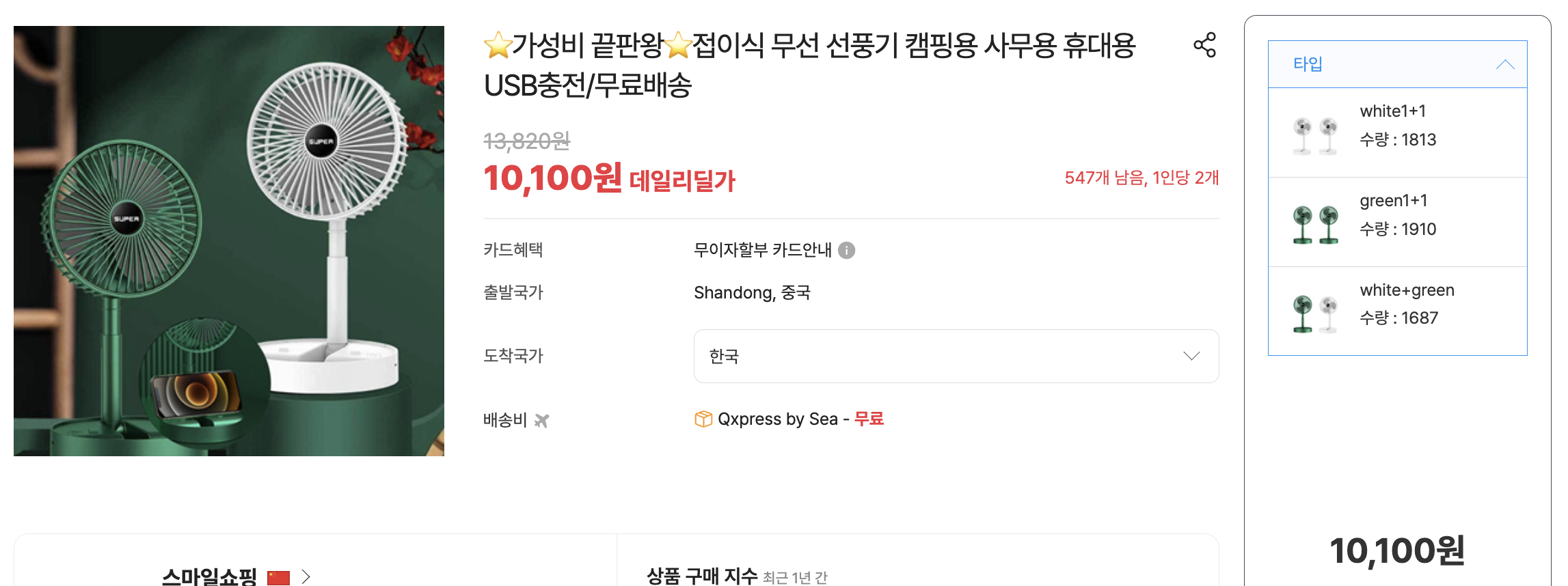 요즘은 가볍게 책상 위에 두고 사용하는 탁상용 선풍기가 대세인데요. 이 제품은 접이식 무선 선풍기로 휴대성까지 갖춘 미니 선풍기 입니다. 무엇보다 가격이 깡패인데요. 특가 기준으로는 1+1으로 10,100원에 판매하고 있어 개당 5,000원 정도에 판매가 되고 있습니다. 그럼 정말 매력적인지 참고해 보시기 바랍니다. 접이식 무선 선풍기 추천 모델입니다.