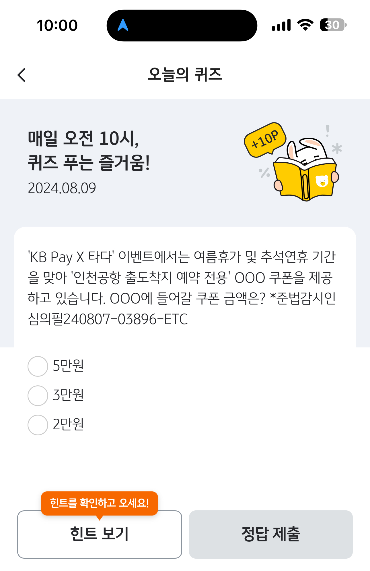 KB Pay 오늘의 퀴즈 정답은 3만원 입니다