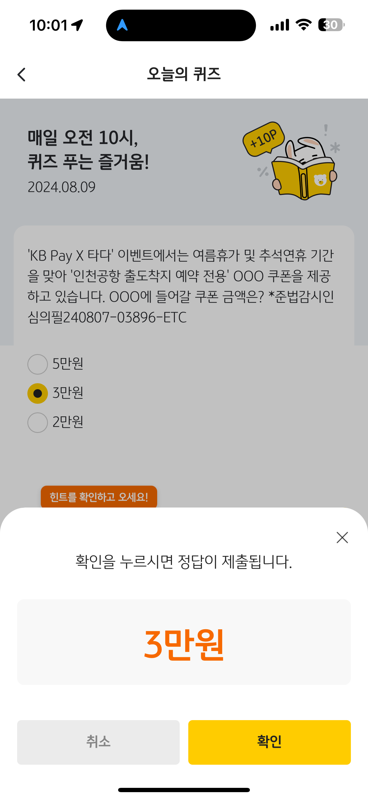 KB Pay 오늘의 퀴즈 정답은 3만원 입니다