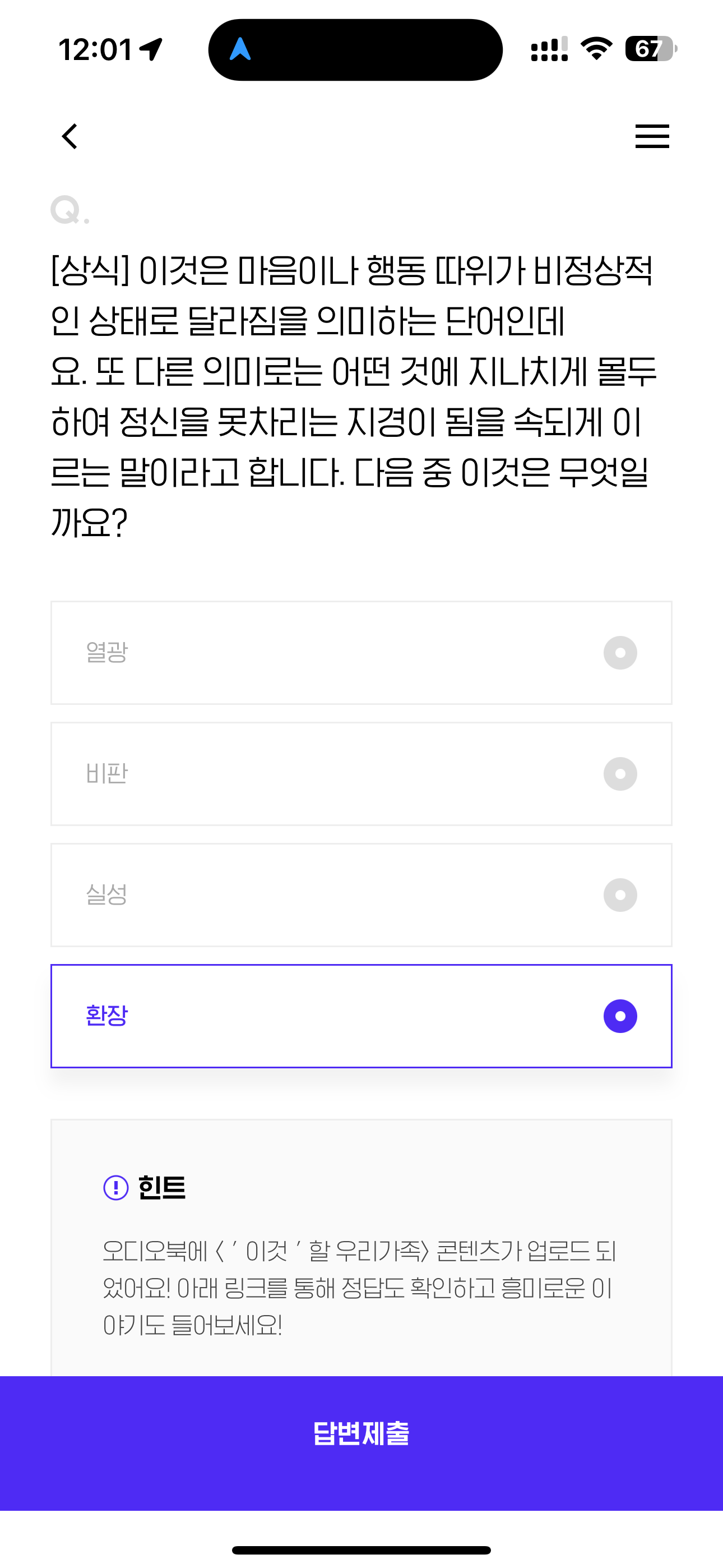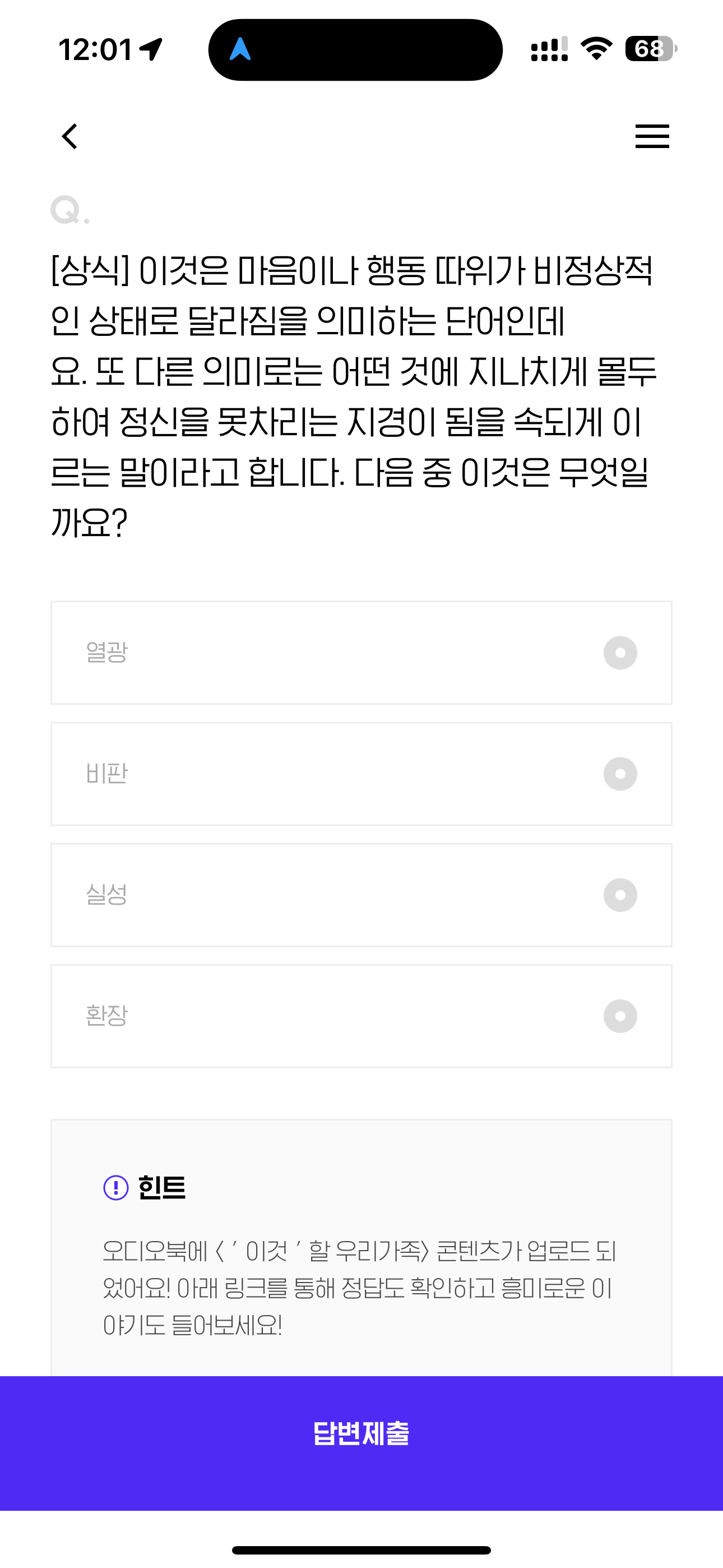 [상식] 이것은 마음이나 행동 따위가 비정상적인 상태로 달라짐을 의미하는 단어인데요. 또 다른 의미로는 어떤 것에 지나치게 몰두하여 정신을 못차라는 지경이 됨을 속되게 이르는 말이라고 합니다. 다음 중 이것은 무엇일까요? 보기는 1. 열광 2. 비판 3. 실성 4. 환장 입니다.