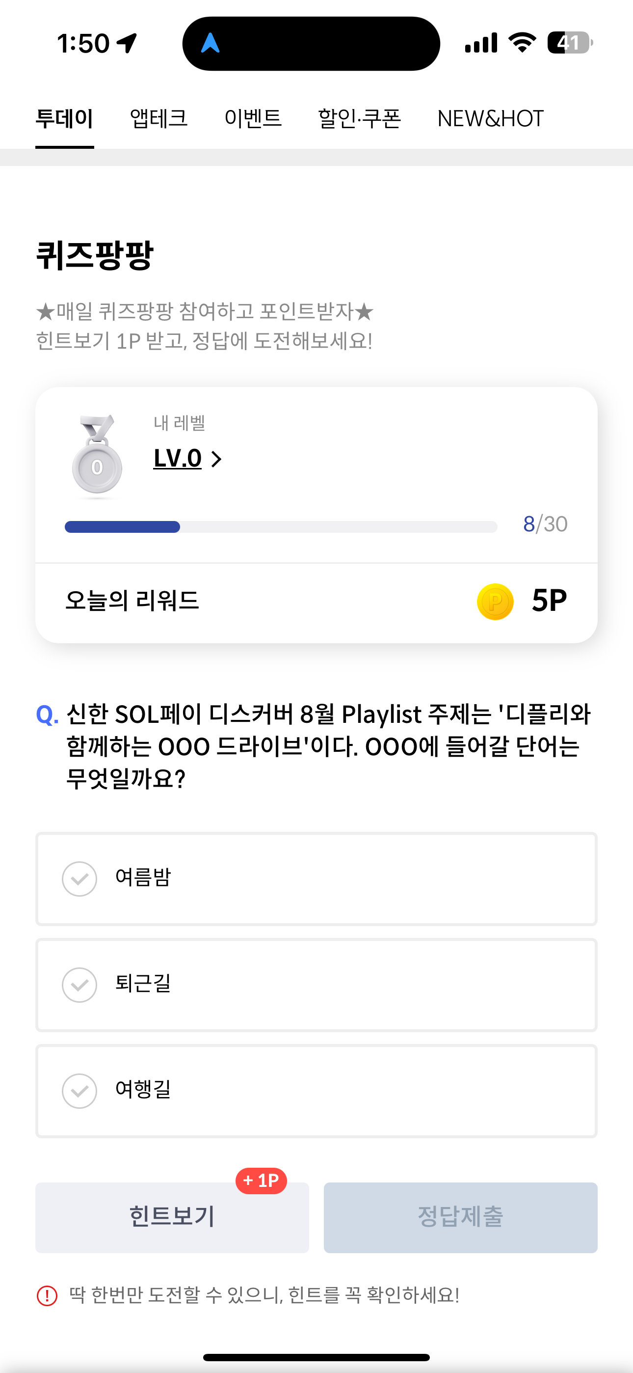 신한 SOL페이 디스커버 8월 Playlist 주제는 '디플리와 함께하는 OOO 드라이브'이다. OOO에 들어갈 단어는 무엇일까요? 보기는 1. 여름밤 2. 퇴근길 3. 여행길 입니다. 신한 SOL페이는 매월 플레이리스트를 통해 큐레이션 음악을 들을 수 있습니다.