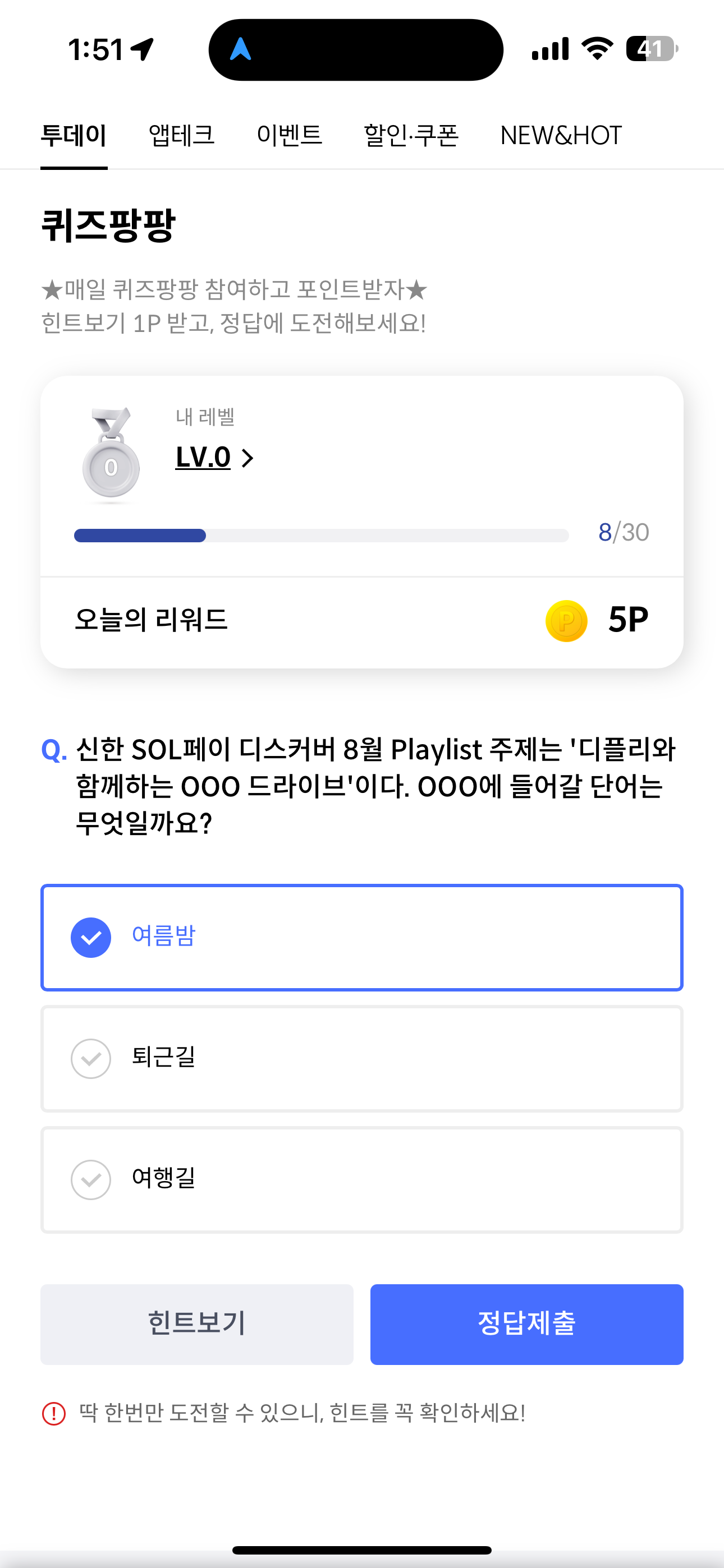 신한카드 퀴즈팡팡 정답은 여름밤 입니다