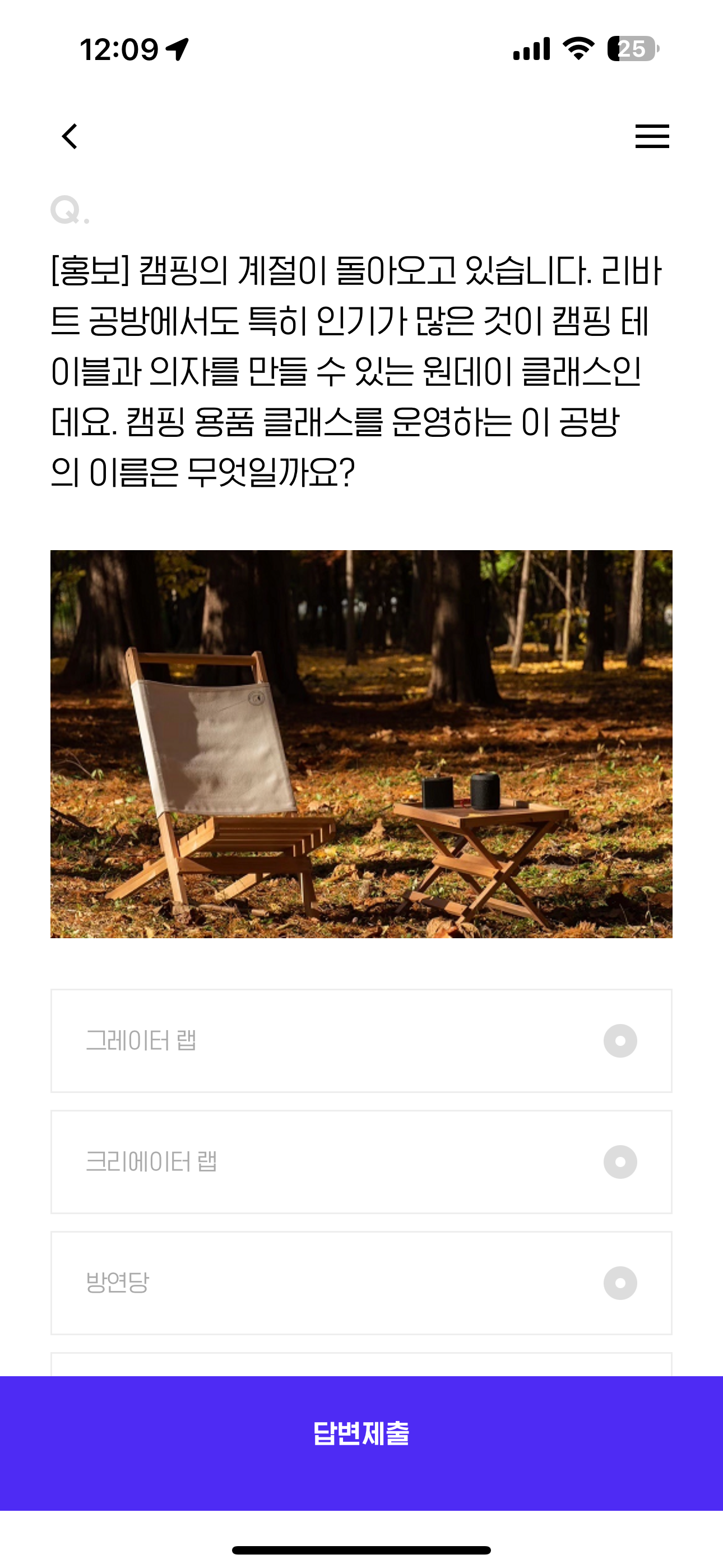 [홍보] 캠핑의 계절이 돌아오고 있습니다. 리바트 공방에서도 특히 인기가 많은 것이 캠핑 테이블과 의자를 만들 수 있는 원데이 클래스인데요. 캠핑 용품 클래스를 운영하는 이 공방의 이름은 무엇일까요? 보기는 1. 그레이터 랩 2. 크리에이터 랩 3. 방연당 4. 크레이트 디자인랩 입니다.