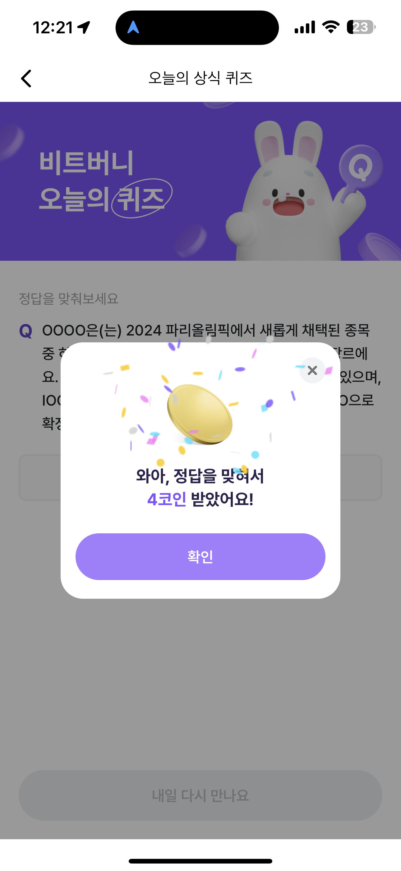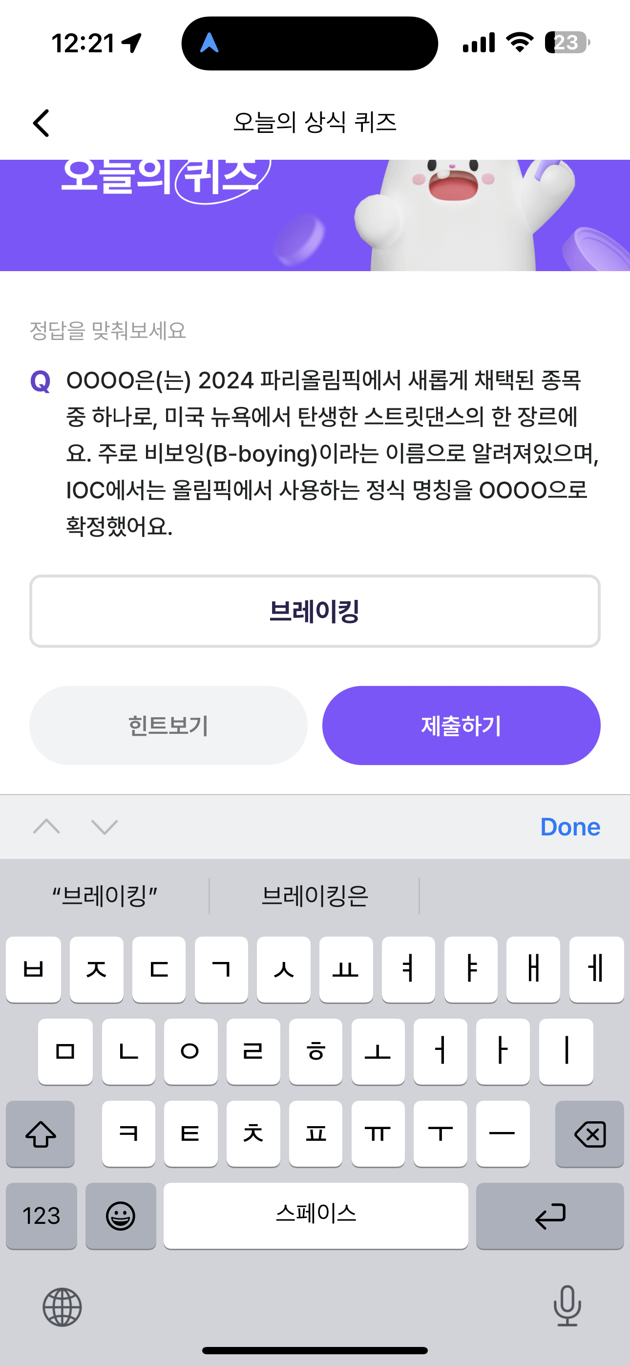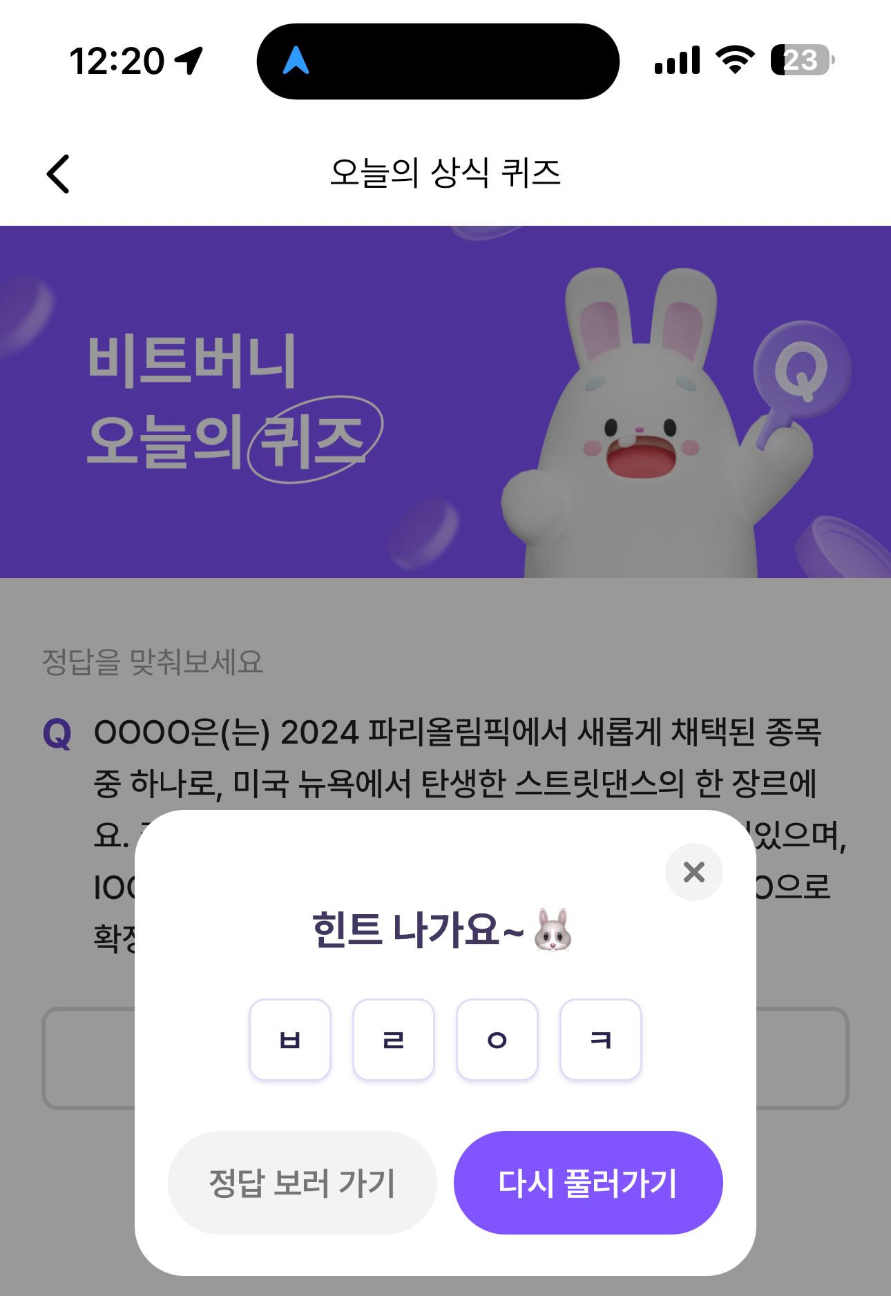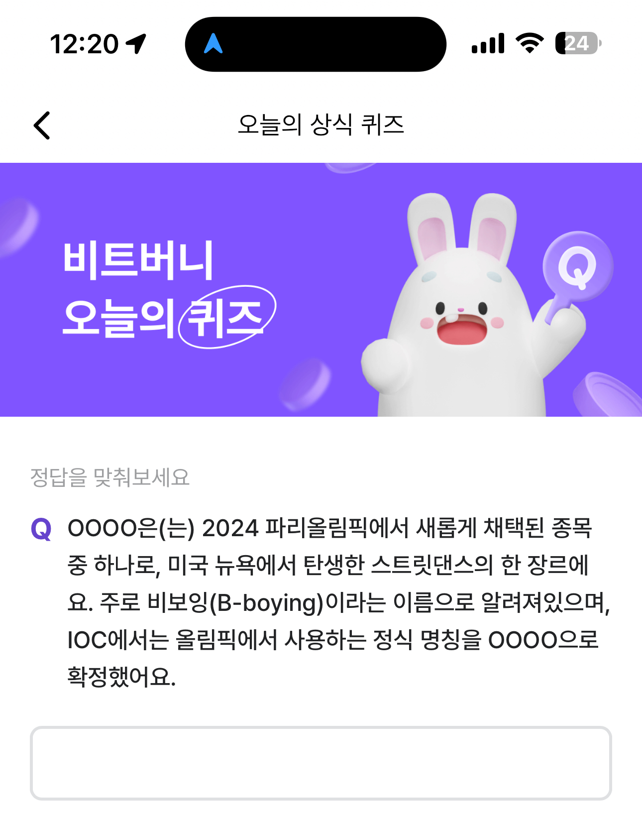 비트버니 오늘의 퀴즈 8월 11일 ㅂㄹㅇㅋ 정답(OOOO은(는) 2024 파리올림픽에서 새롭게 채택된 종목 중 하나로, 미국 뉴욕에서 탄생한 스트릿댄스의 한 장르에요)