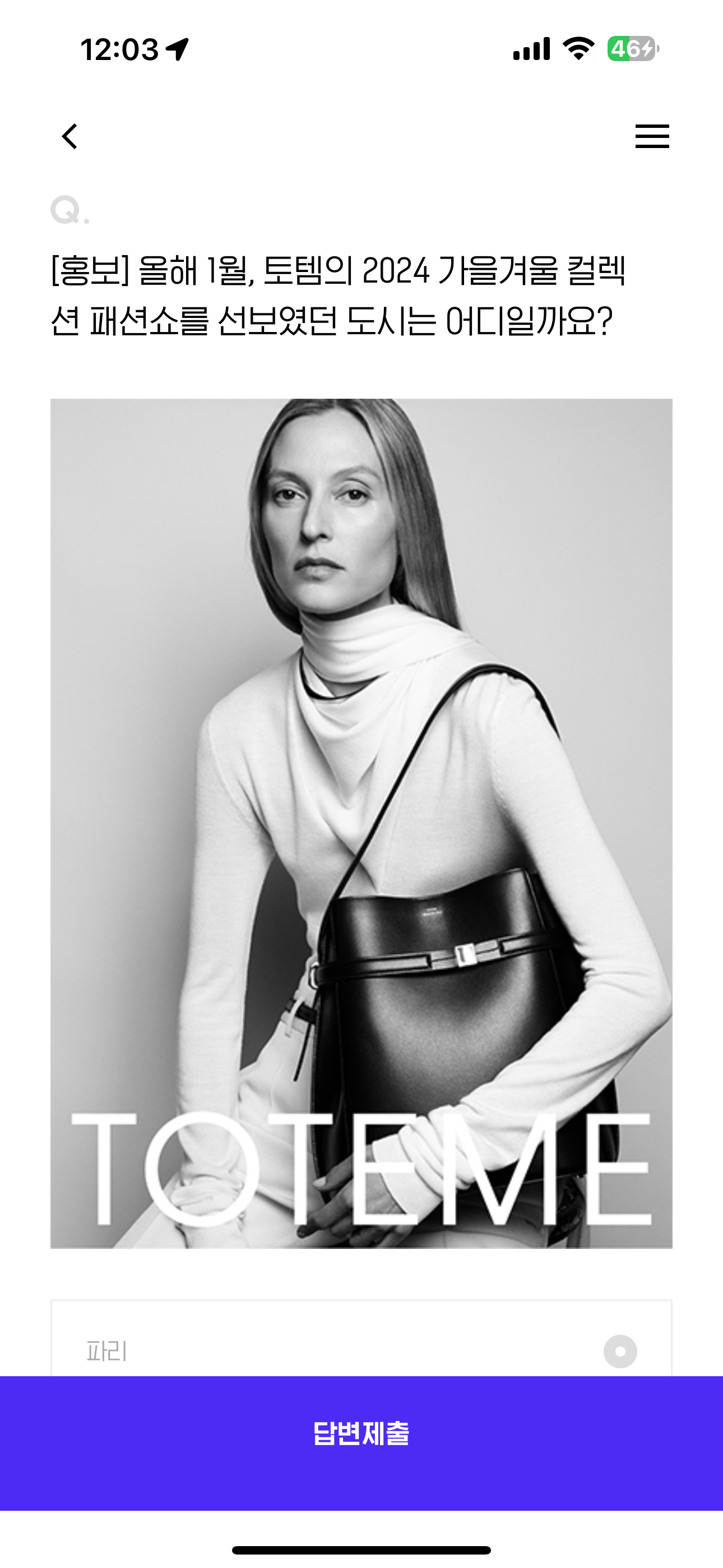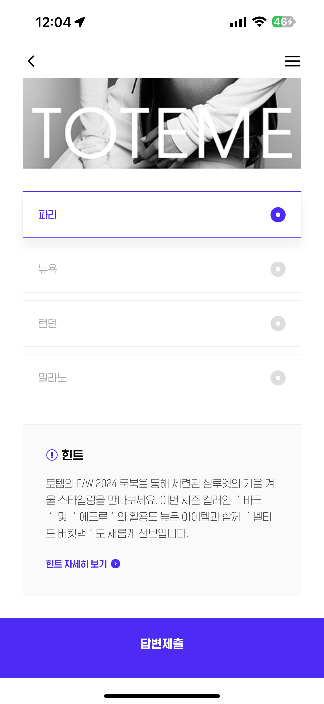 H포인트 퀴즈 8월 12일 정답(올해 1월, 토템의 2024 가을겨울 컬렉션 패션쇼를 선보였던 도시는 어디일까요?)
