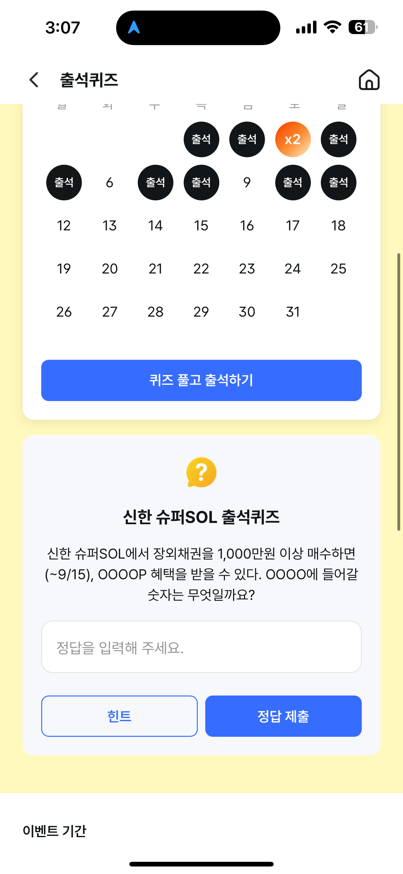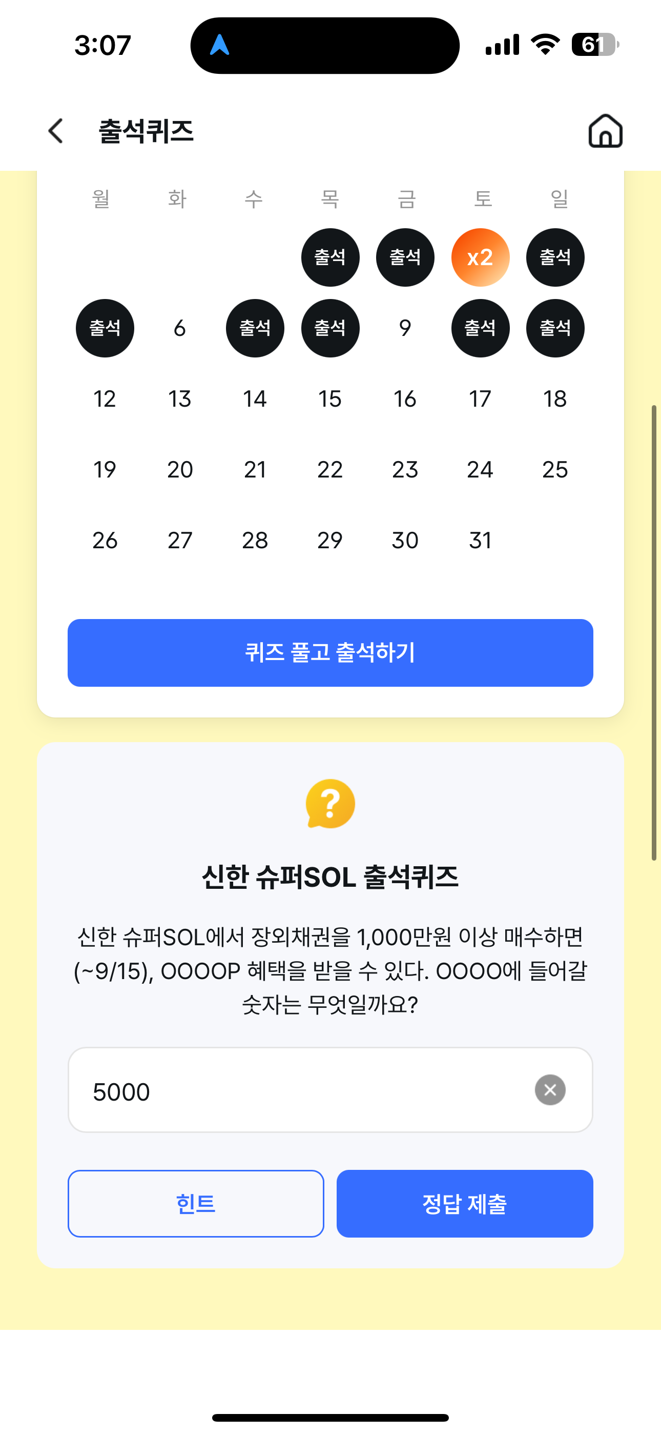 신한 슈퍼SOL 출석퀴즈 정답은 5000 입니다