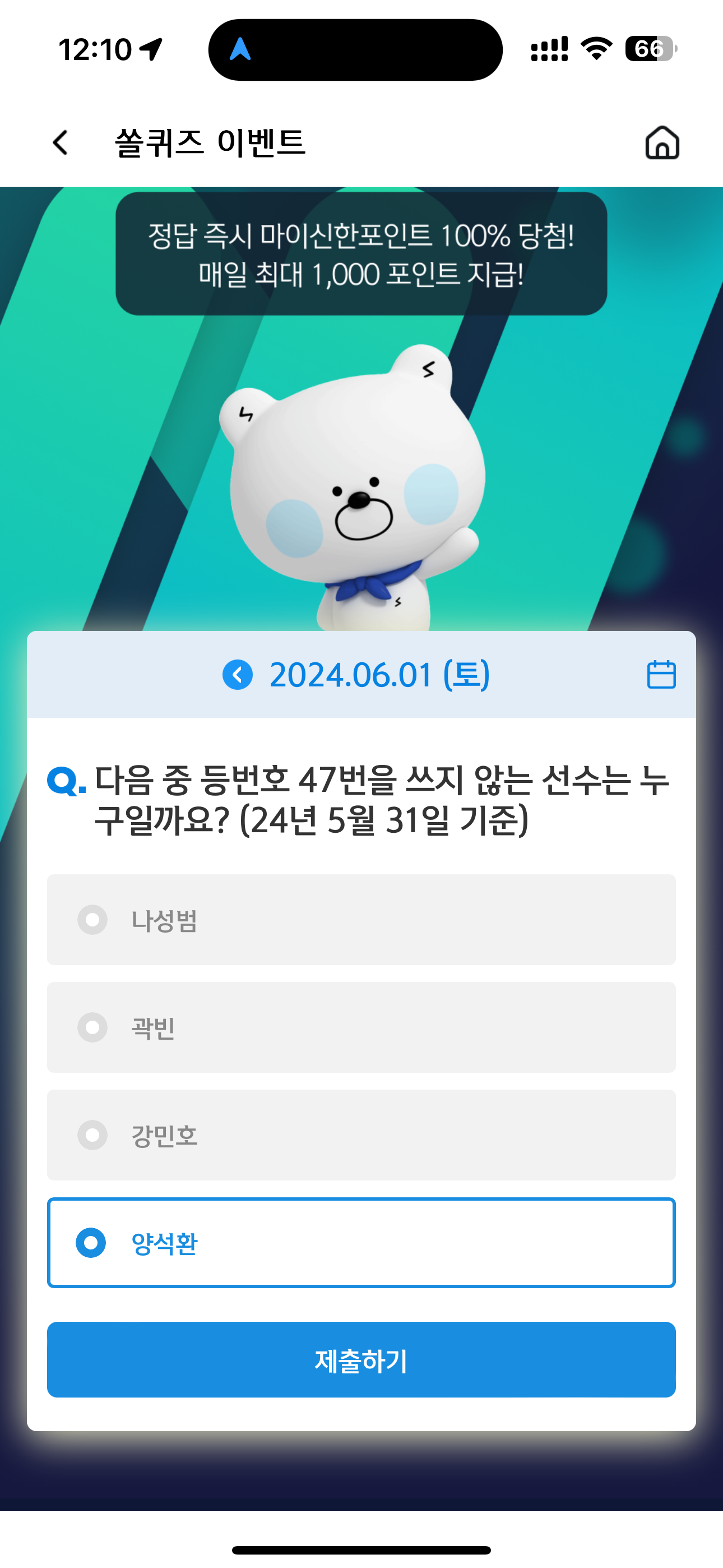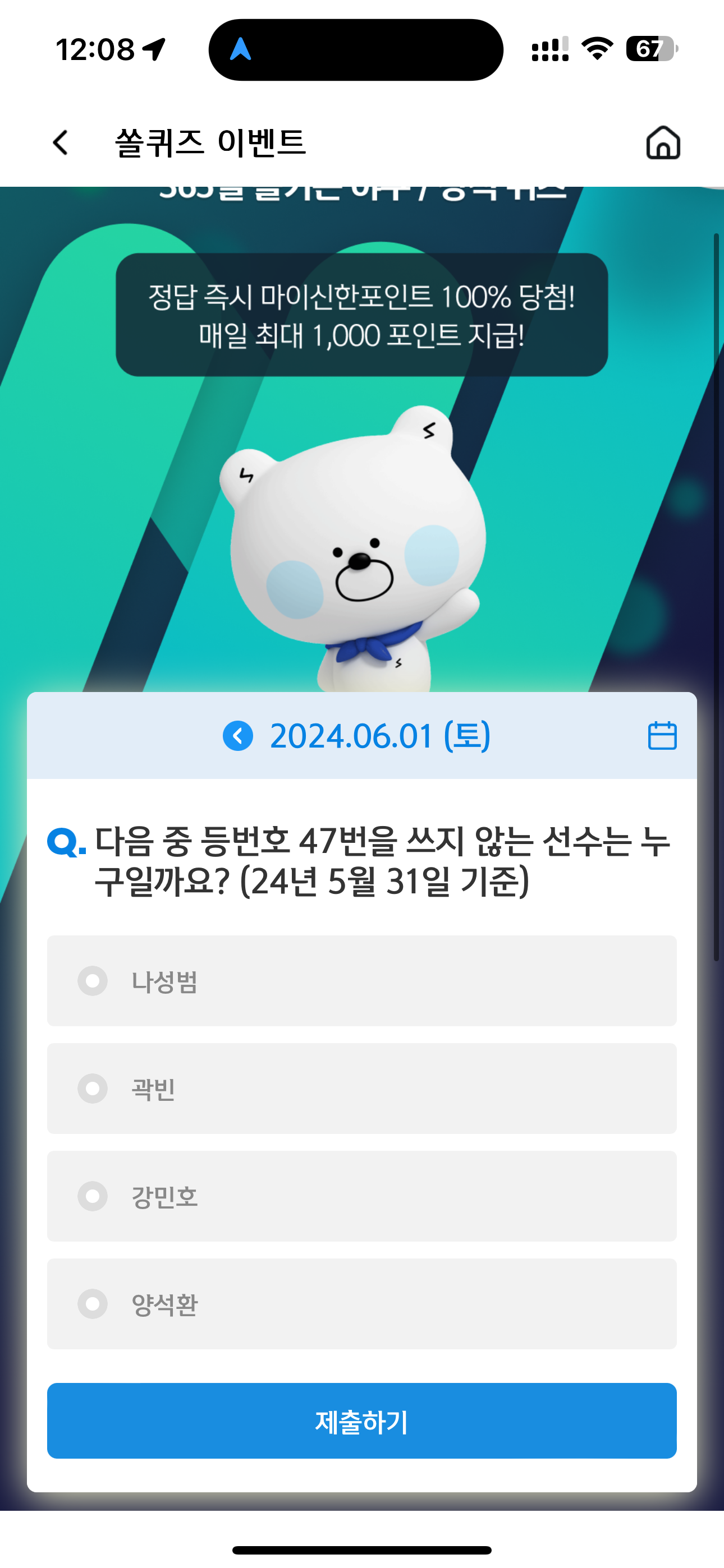 신한 슈퍼SOL 야구/상식 쏠퀴즈 6월 1일 문제입니다