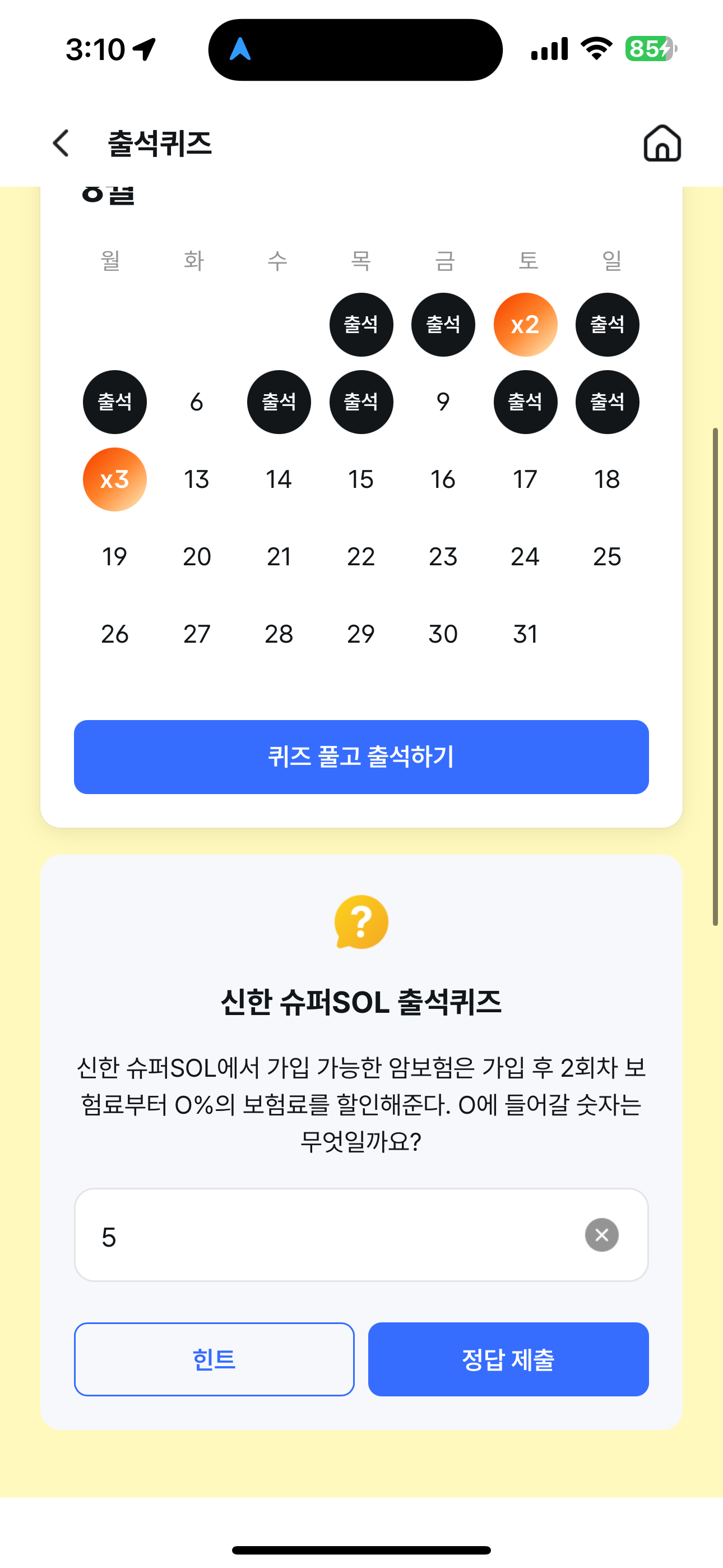 신한 슈퍼SOL 출석퀴즈 정답은 5 입니다