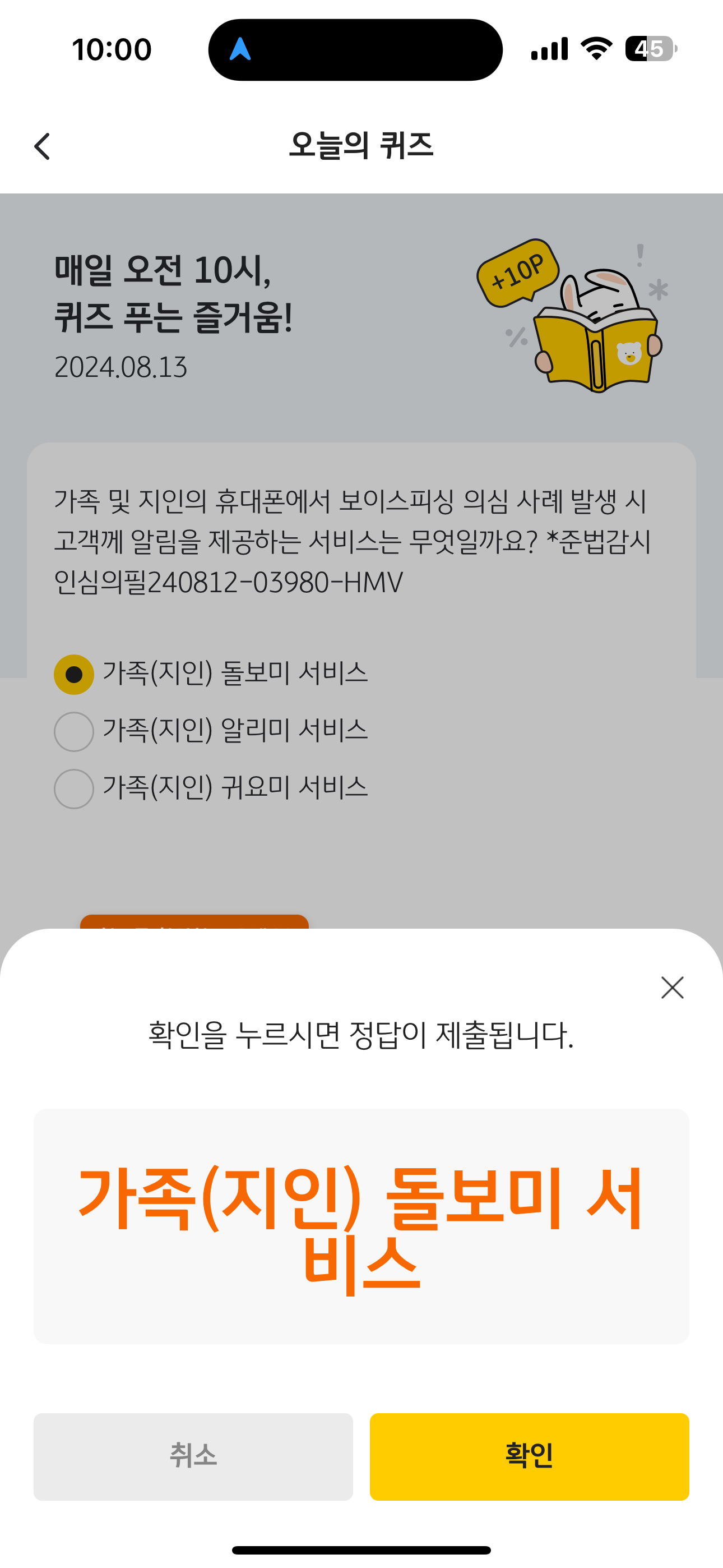 가족 및 지인의 휴대폰에서 보이스피싱 의심 사례 발생 시 고객께 알림을 제공하는 서비스는 무엇일까요? *준법감시인심의필240812-03980-HMV 보기는 1. 가족(지인) 돌보미 서비스 2. 가족(지인) 알리미 서비스 3. 가족(지인) 귀요미 서비스 입니다. 요즘 보이스피싱 피혜 사례들이 많은데요. 참고해 두세요