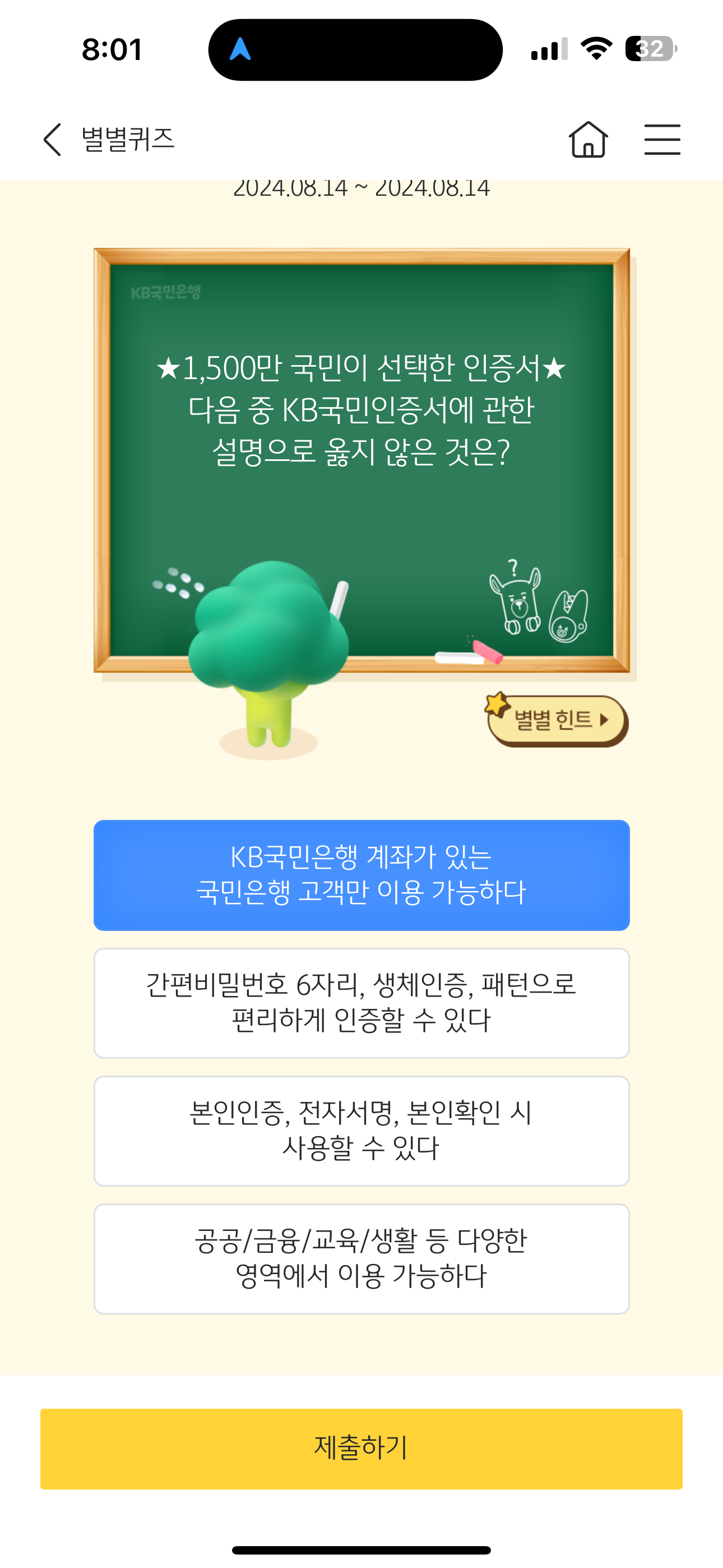 KB스타뱅킹 별별퀴즈 8월 14일 문제입니다