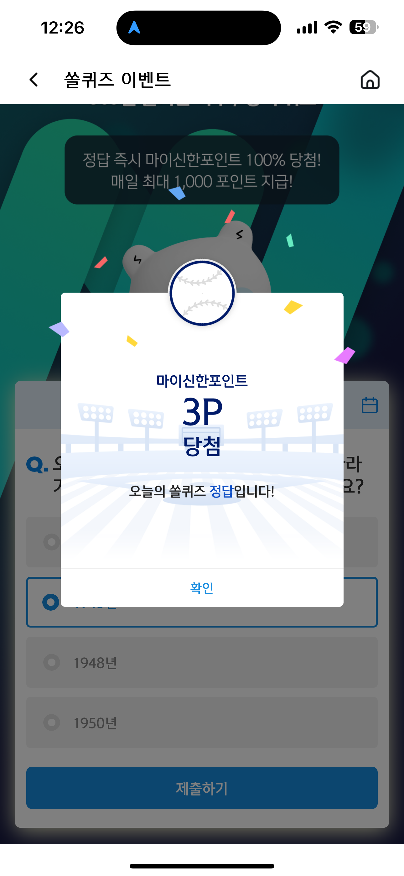 신한 슈퍼SOL 야구/상식 쏠퀴즈 정답은 1945년 입니다