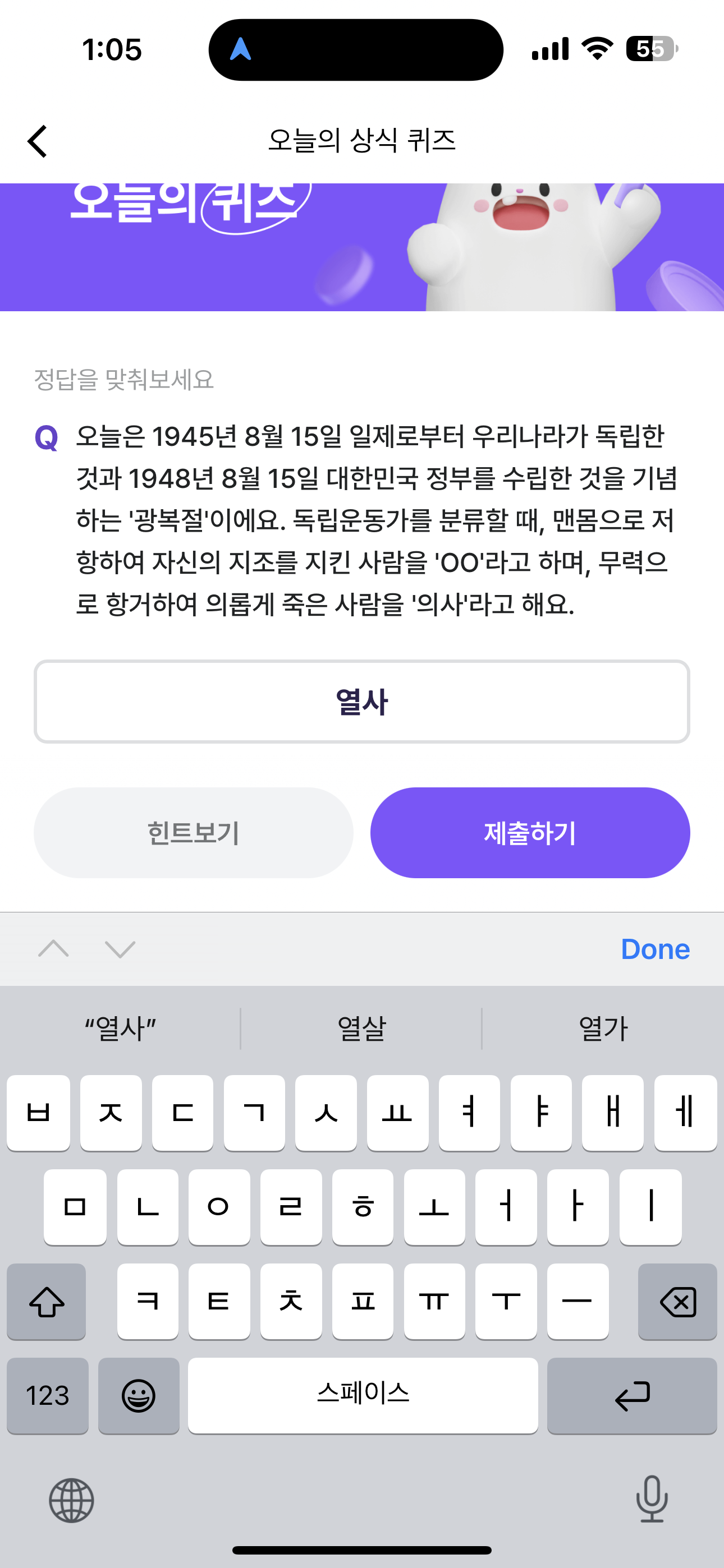 오늘은 1945년 8월 15일 일제로부터 우리나라가 독립한 것과 1948년 8월 15일 대한민국 정부를 수립한 것을 기념하는 '광복절'이에요. 독립운동가를 분류할 때, 맨몸으로 저항하여 자신의 내조를 지킨 사람을 'OO'라고 하며, 무력으로 항거하여 의롭게 죽은 사람을 '의사'라고 해요. 주관식 퀴즈인데요.