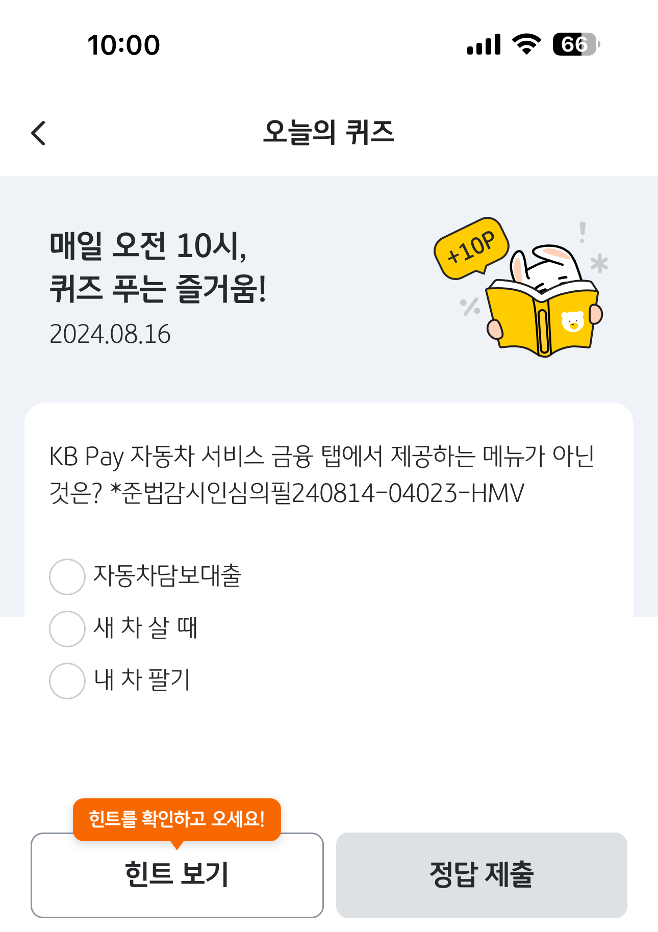 KB pay 오늘의 퀴즈 정답은 내 차 팔기 입니다
