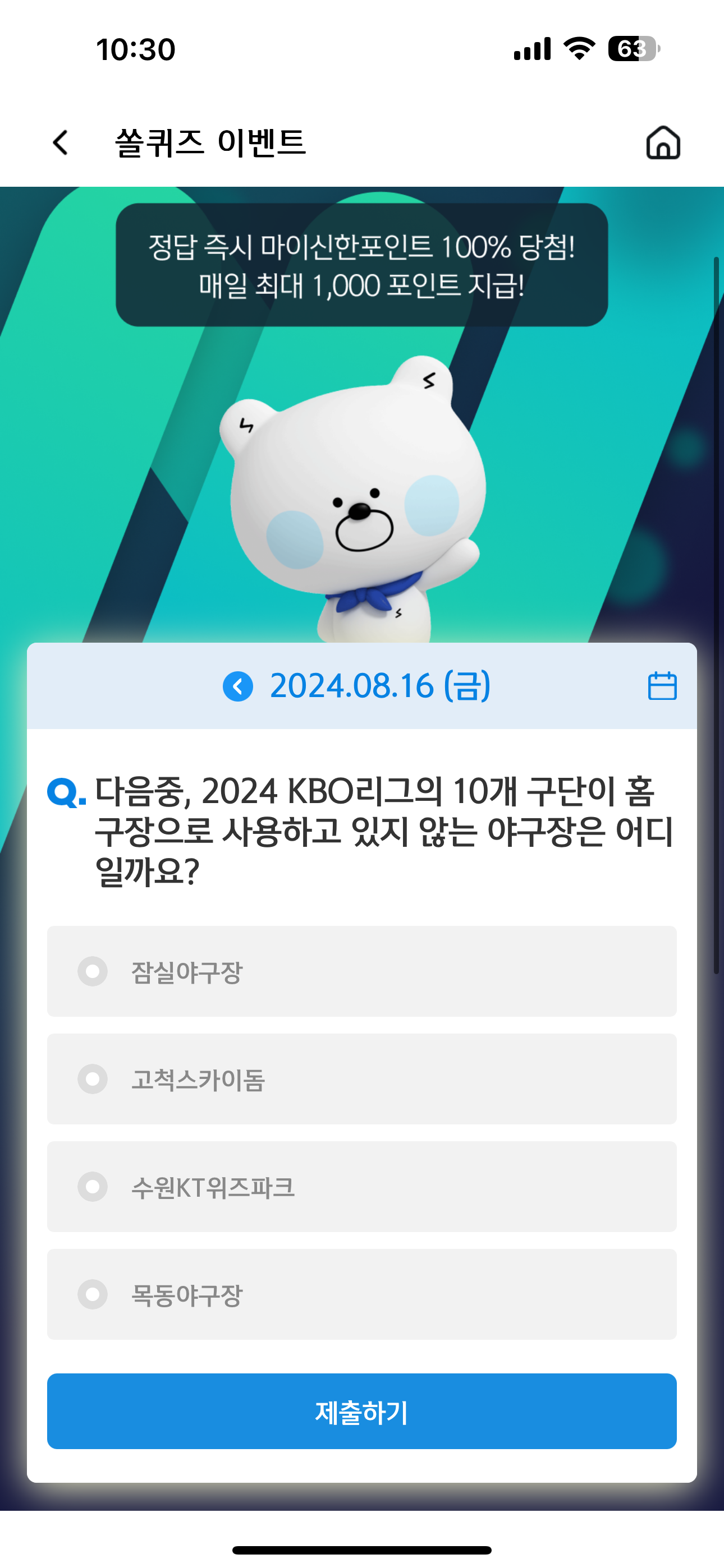 신한 슈퍼SOL 야구/상식 쏠퀴즈 8월 16일 문제입니다