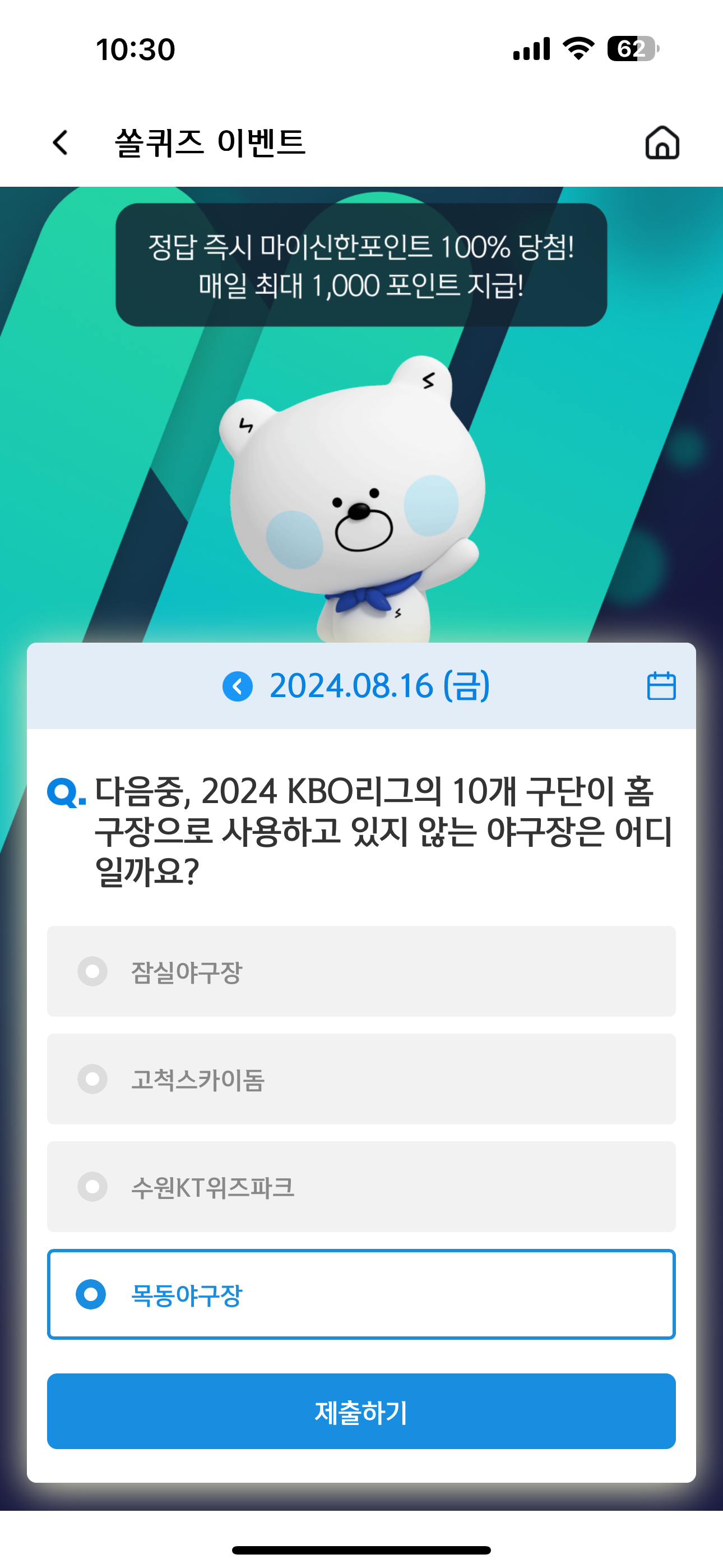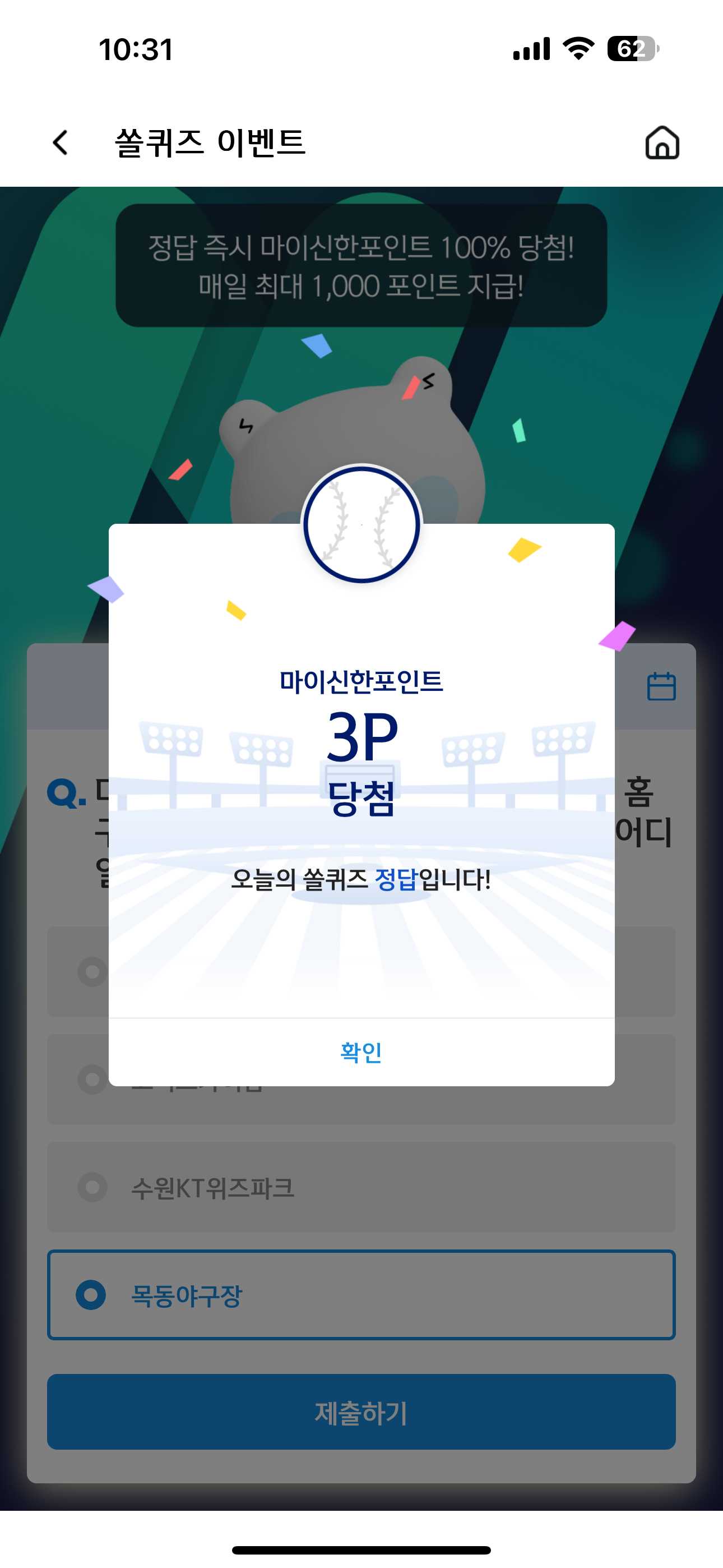 신한 슈퍼SOL 야구/상식 쏠퀴즈 정답은 목동야구장 입니다