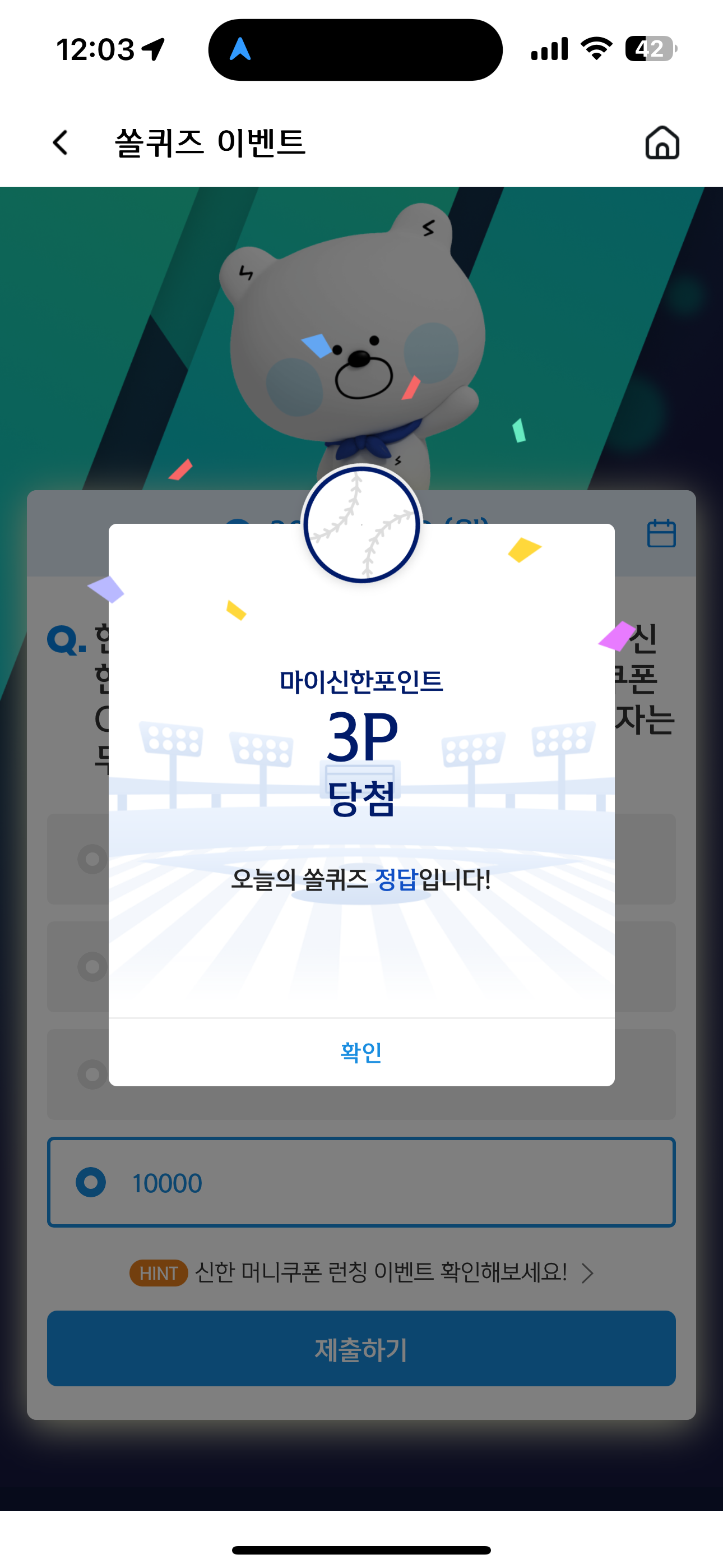 신한 슈퍼SOL 야구/상식 쏠퀴즈 정답은 10000 입니다
