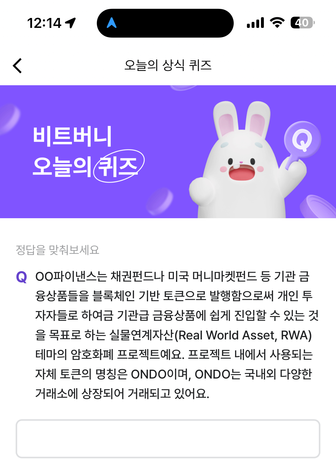 비트버니 오늘의 퀴즈 8월 19일 ㅇㄷ 정답( OO파이낸스는 채권펀드나 미국 머니마켓펀드 등 기관 금융상품들을 블록체인 기반 토큰으로 발행함으로써 개인 투자자들로 하여금 기관급 금융상품에 쉽게 진입할 수 있는 것을 목표로)