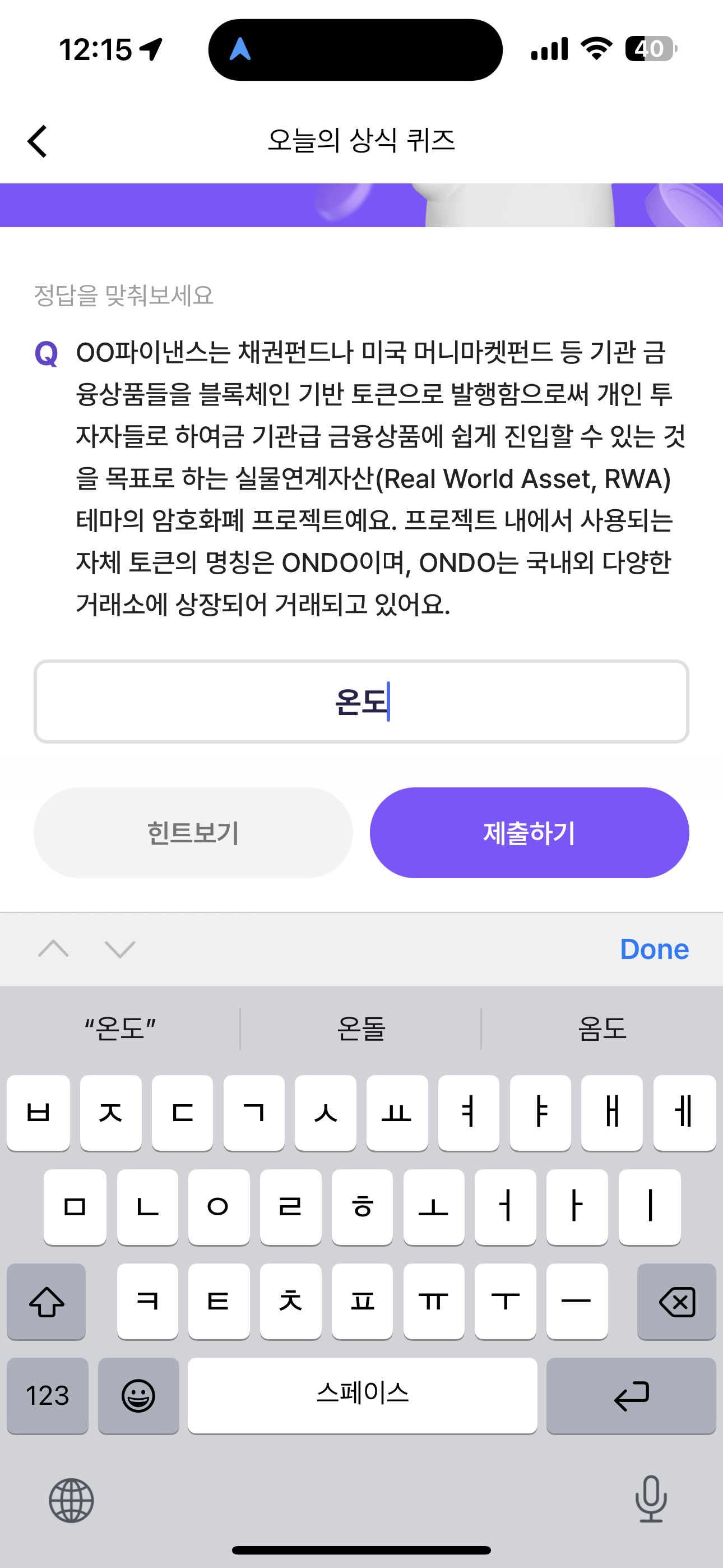 OO파이낸스는 채권펀드나 미국 머니마켓펀드 등 기관 금융상품들을 블록체인 기반 토큰으로 발행함으로써 개인 투자자들로 하여금 기관급 금융상품에 쉽게 진입할 수 있는 것을 목표로 하는 실물연계자산(Real World Asset, RWA) 테마의 암호화폐 프로젝트예요 프로젝트 내에서 사용되는 자체 토큰의 명칭은 ONDO이며, ONDO는 국내외 다양한 거래소에 상장되어 거래되고 있어요. 주관식 퀴즈인데요.