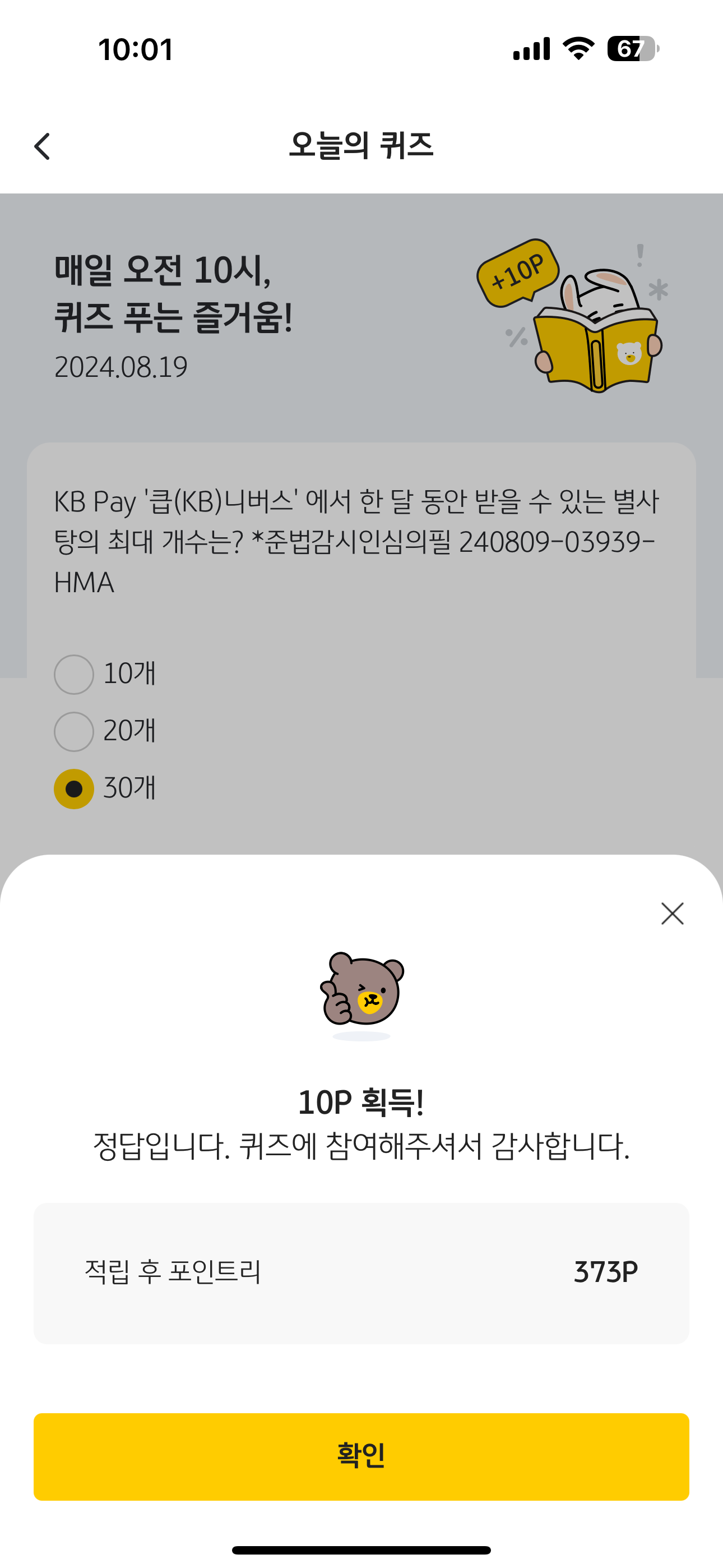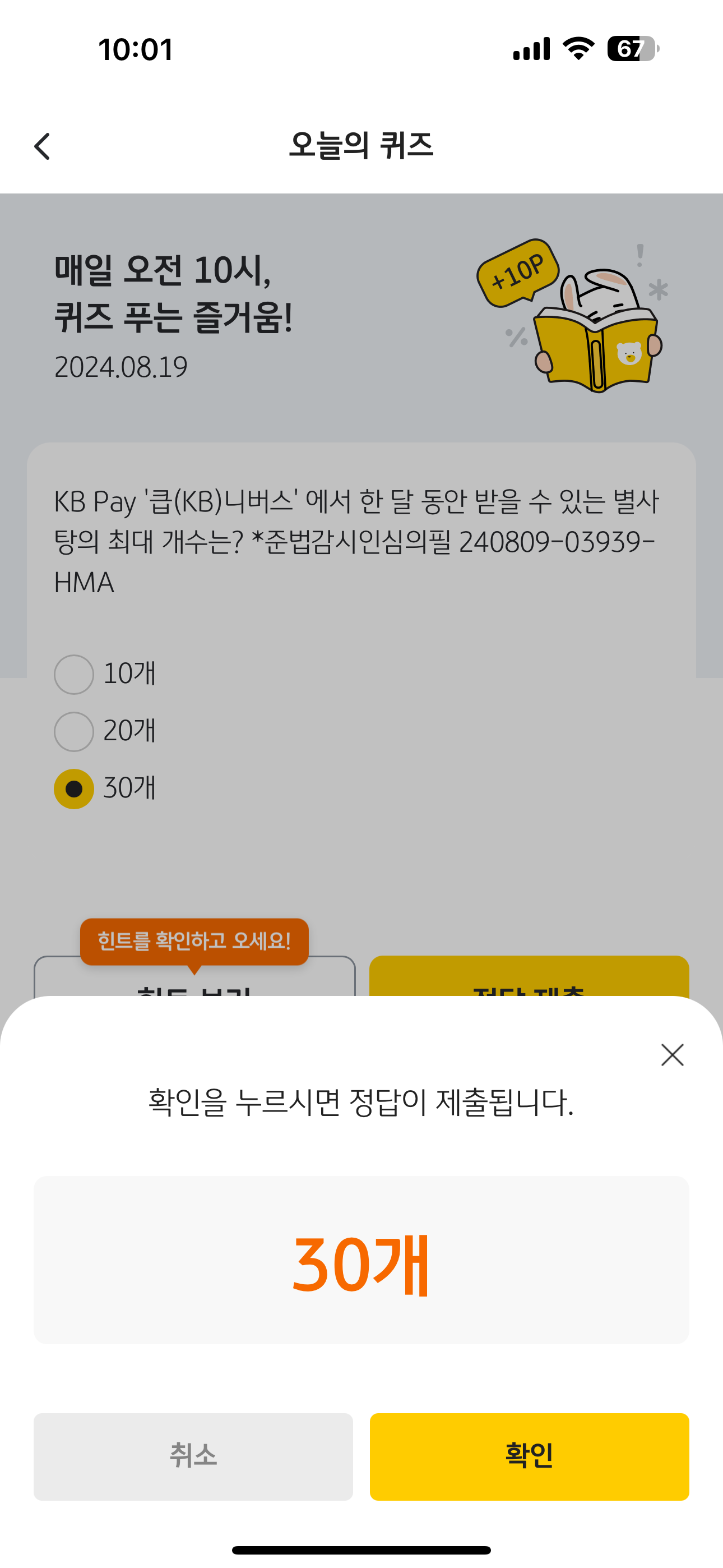 KB Pay 오늘의 퀴즈 정답은 30개 입니다