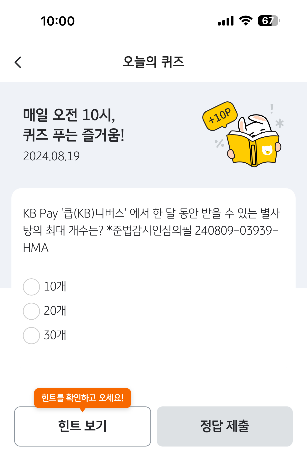 KB Pay '큽(KB)니버스' 에서 한 달 동안 받을 수 있는 별사탕의 최대 개수는? *준법감시인심의필 240809-03939-HMA 보기는 1. 10개 2. 20개 3. 30개 입니다. KB Pay에서는 별사탕을 받아 포인트로 변경이 가능합니다. 결제와 함께 주어지는 최고의 혜택이니 잘 활용해 보세요