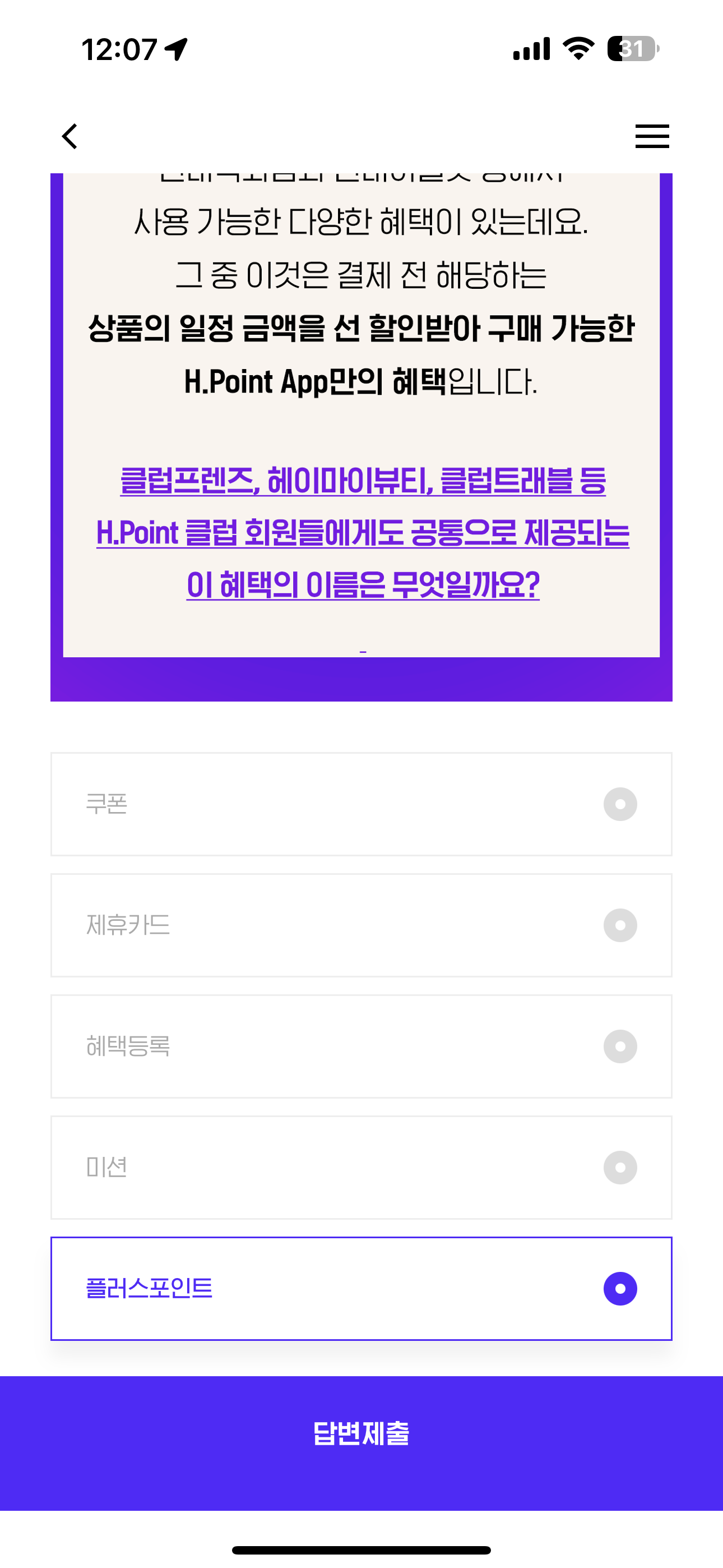 H포인트 퀴즈 정답은 플러스포인트 입니다.